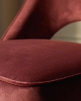The Clover toffee red velvet dining chair brings mid-century sophistication to modern dining. Its curved, scooped back and generously padded seat create a cocoon of comfort, while the rich toffee red recycled velvet adds warmth and vintage charm. Perfect for long dinner parties or quick morning coffees, these chairs transform any table into a stylish gathering spot.
