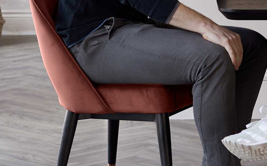 The Clover toffee red velvet dining chair brings mid-century sophistication to modern dining. Its curved, scooped back and generously padded seat create a cocoon of comfort, while the rich toffee red recycled velvet adds warmth and vintage charm. Perfect for long dinner parties or quick morning coffees, these chairs transform any table into a stylish gathering spot.