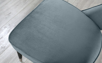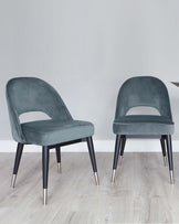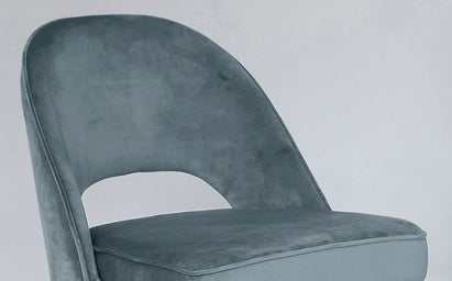 The Clover blue grey velvet dining chair brings mid-century style to modern dining spaces. Its distinctive curved back and plush velvet upholstery create an inviting seat for long dinners and lively conversations. Sold as a pair, these chairs feature brushed stainless-steel legs and built-in adjustable floor protectors for stability on any surface.