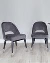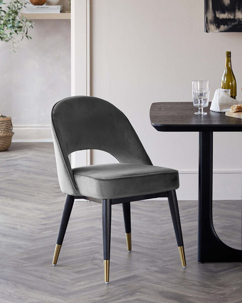 The Clover dark grey velvet dining chair brings sophisticated comfort to mealtimes and dinner parties alike. Plush velvet upholstery in rich dark grey creates an inviting seat, while the gently curved back provides support through long conversations. Solid wooden legs with stainless steel caps add a contemporary touch, making these chairs perfect for both everyday meals and special occasions.