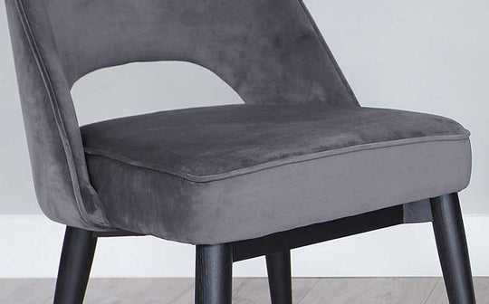 The Clover dark grey velvet dining chair brings sophisticated comfort to mealtimes and dinner parties alike. Plush velvet upholstery in rich dark grey creates an inviting seat, while the gently curved back provides support through long conversations. Solid wooden legs with stainless steel caps add a contemporary touch, making these chairs perfect for both everyday meals and special occasions.