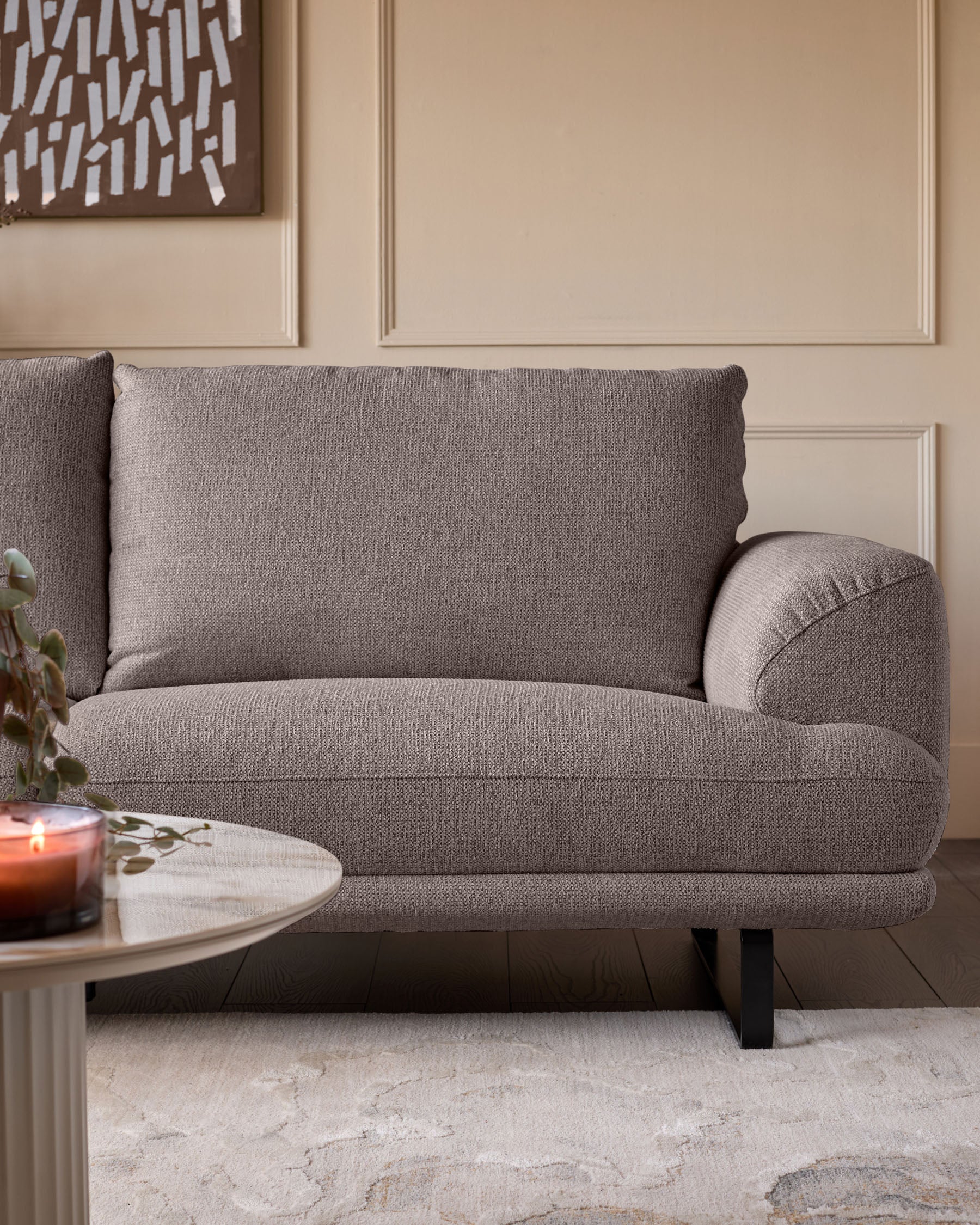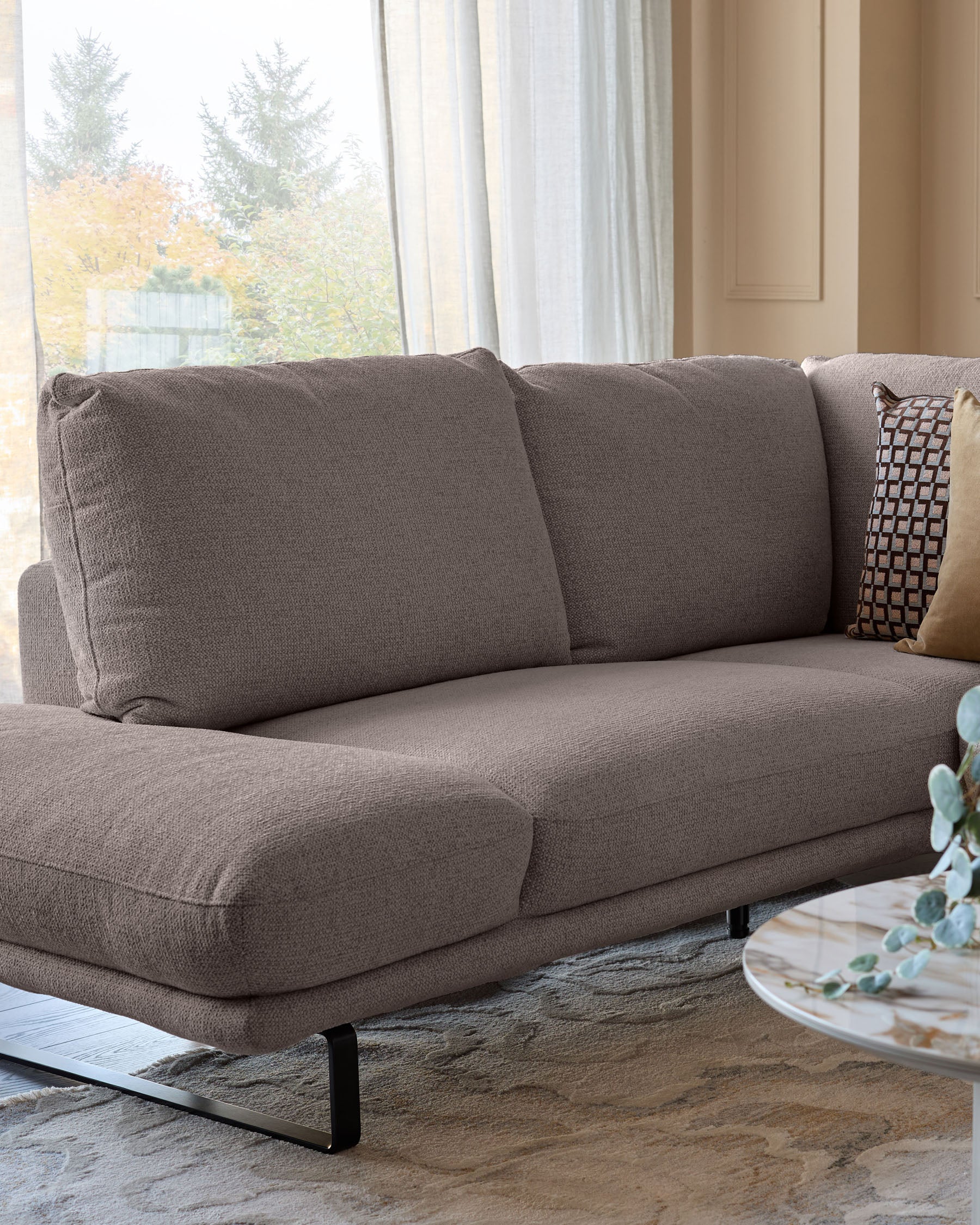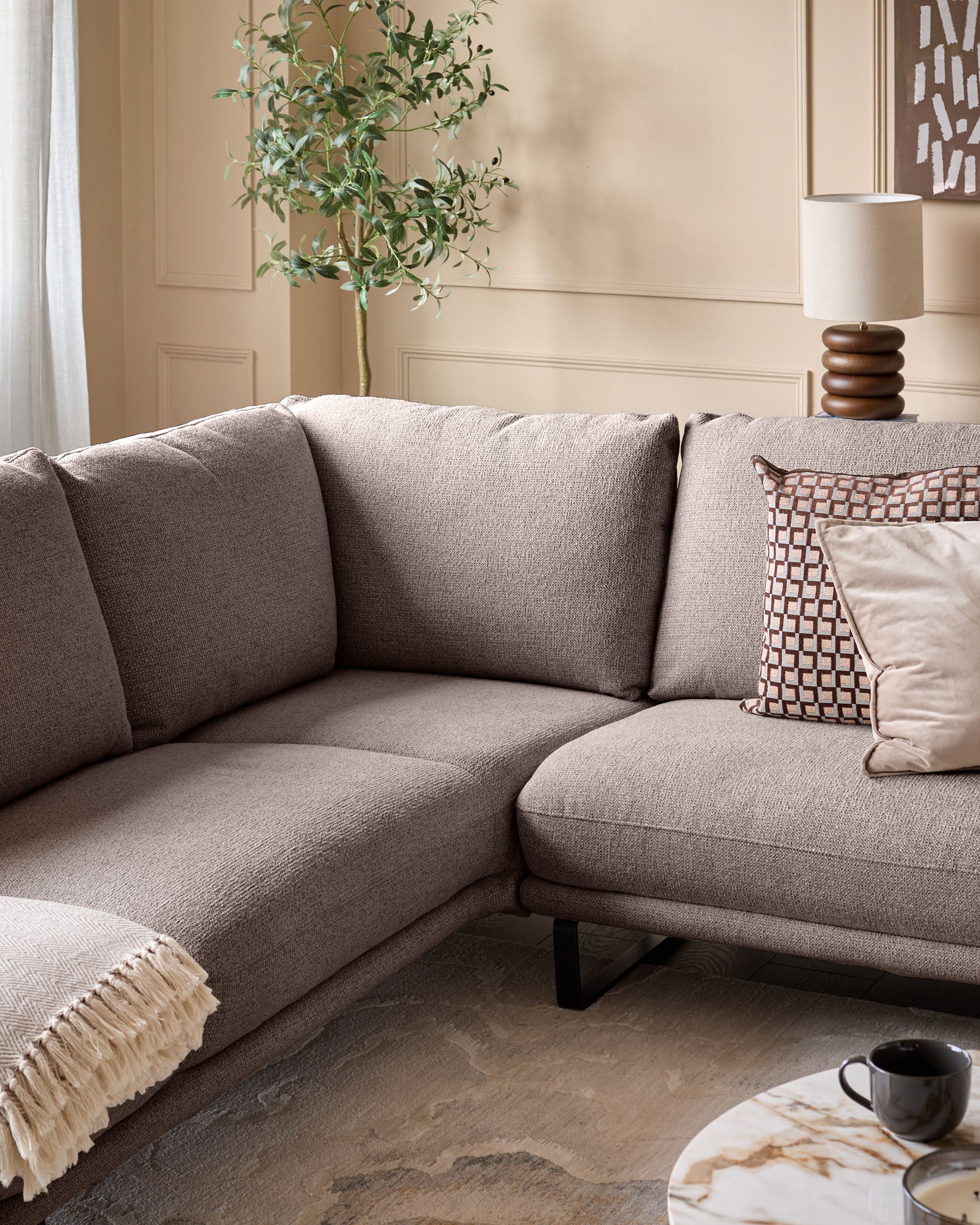 The Colette sofa in Mink plush chenille brings a soothing, understated luxury to your living space. Its left-hand configuration creates an inviting shape, perfect for gatherings and the quieter pauses of everyday life. Designed with intention, the integrated armrest flows seamlessly into the seat cushion, giving Colette its signature sculpted look. High loop-style legs create a floating appearance, lifting the sofa visually and adding elegant lightness. The plush chenille upholstery is beautifully soft with durability that stands up to real-life behaviour. Crafted in small, carefully planned runs, each piece offers the balance of function and beauty that defines our collection. Built to last and made to live with, Colette transforms the room with effortless grace.