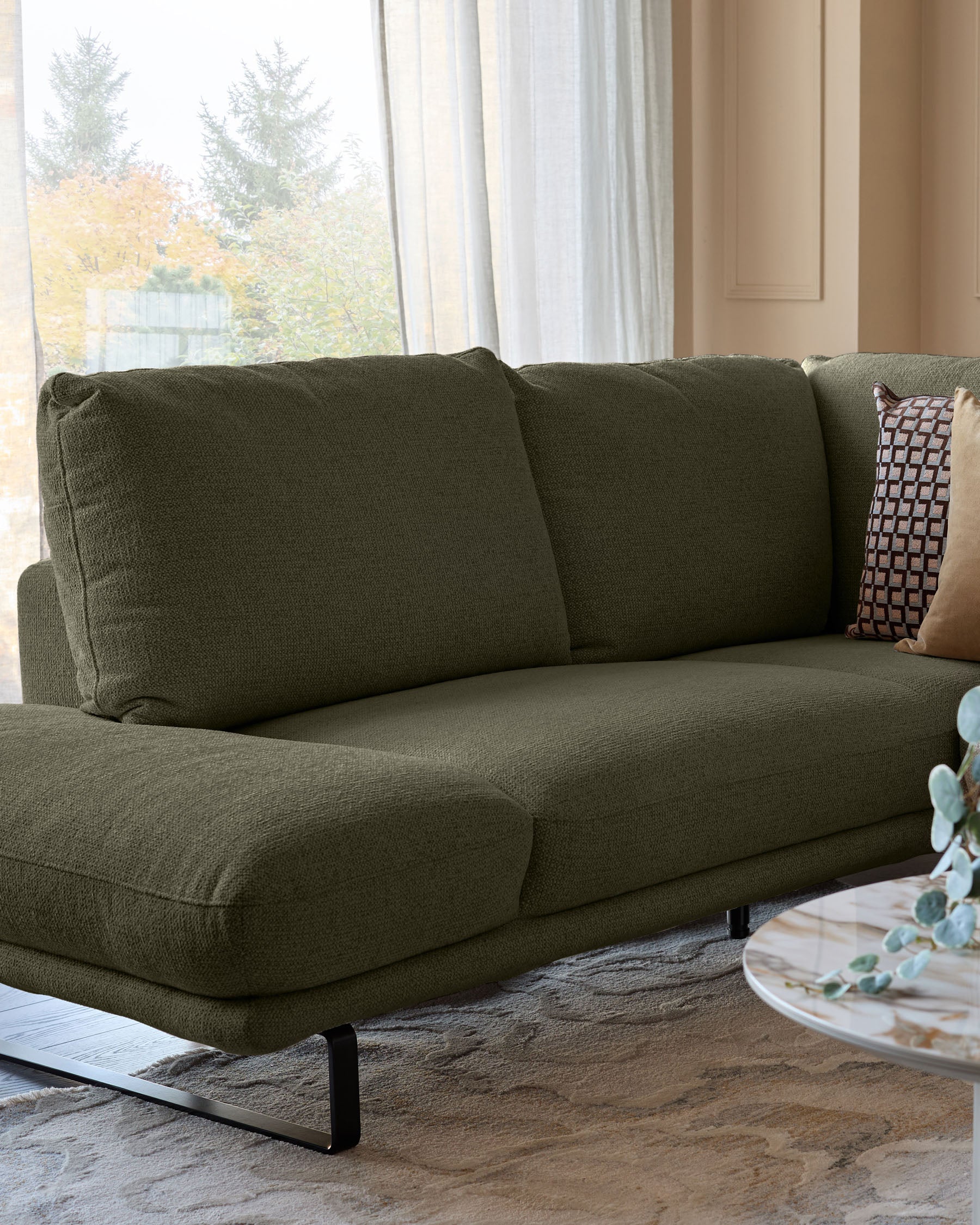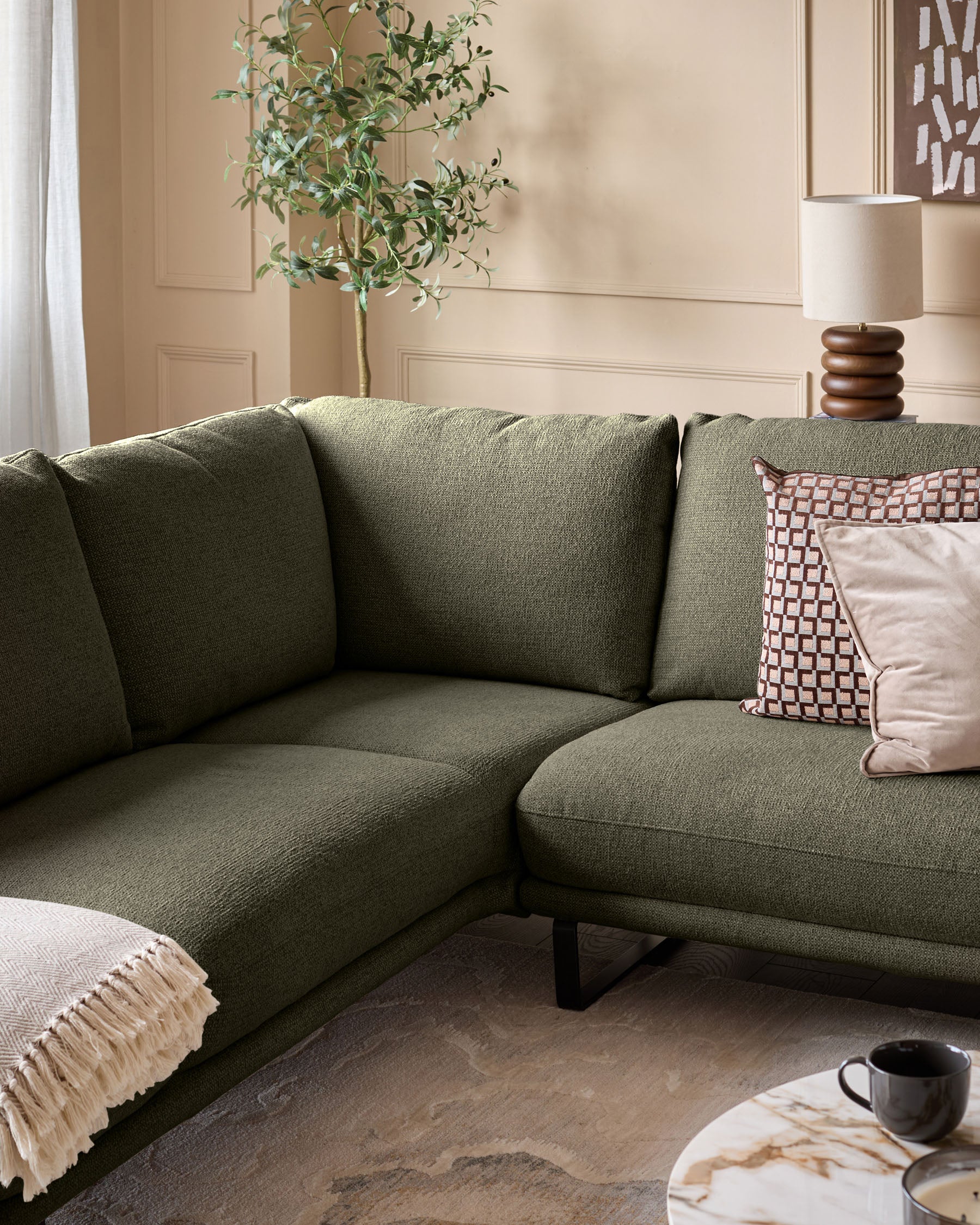 The Colette sofa in Olive Green plush chenille brings a rich, grounding calm to your living space designed for real-life moments and gatherings. Its left-hand configuration offers an easy, natural flow, while the integrated armrest sweeps into the seat cushion, creating a beautifully cohesive, crafted silhouette. Elevated on high loop-style legs, Colette appears to float, offering a light, effortless presence even in compact rooms. In our Design Studio, every detail was shaped with intention, balancing deep comfort with a clean, contemporary profile. The plush chenille feels wonderfully tactile yet remains tough enough for everyday behaviour. Whether you're stretching out, hosting or simply taking a quiet moment, Colette adapts with graceful ease. Built to last and made for the moments that matter, it's where function meets beauty.