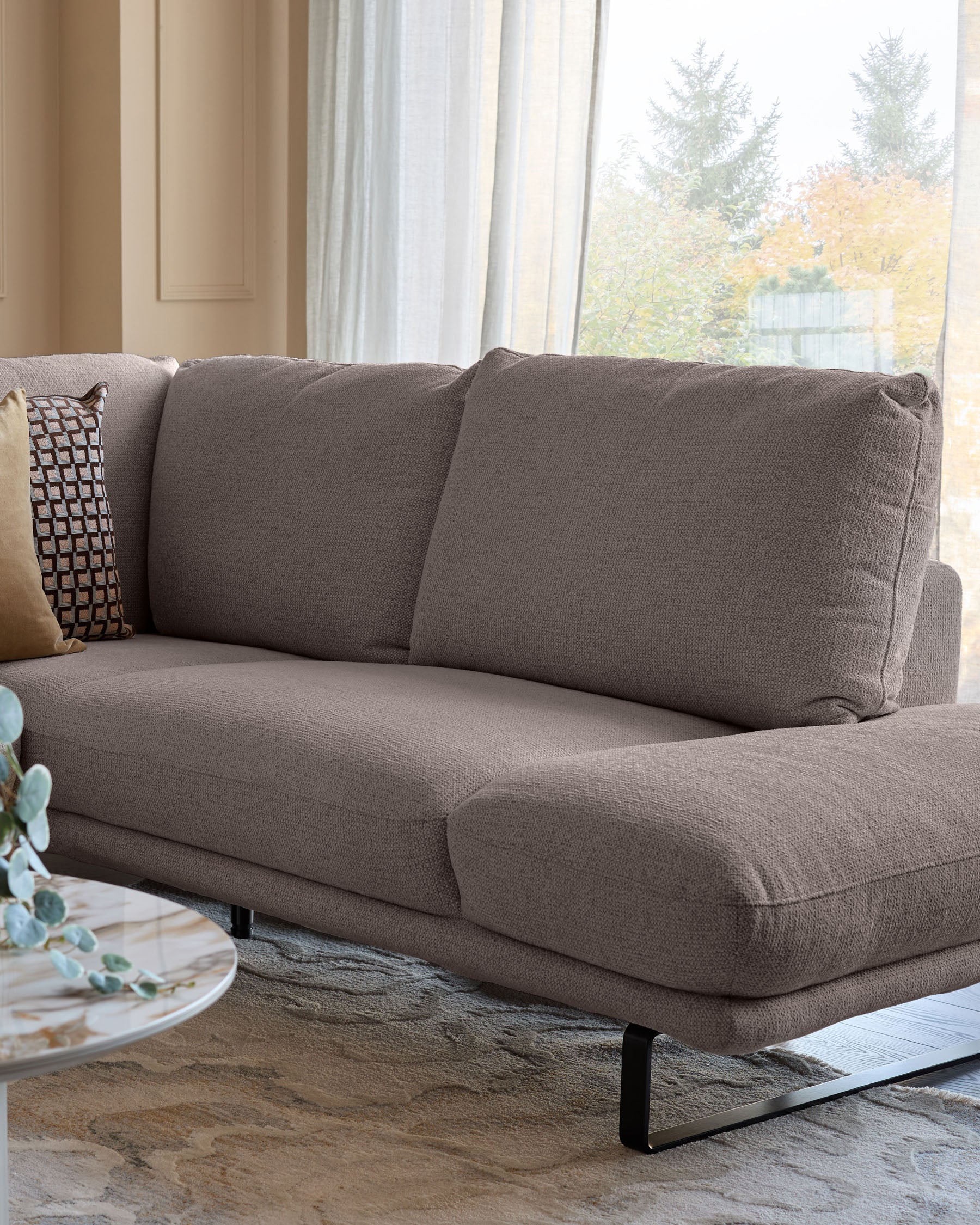 In Mink plush chenille, the right-hand Colette sofa is a calming, contemporary anchor for your living space. Its right-hand curve opens the room, creating an easy, flowing layout that naturally brings people together. The integrated armrest that melts into the seat cushion gives Colette its distinctive, crafted edge, while the high loop-style legs lift the silhouette for a refined floating effect. Selected thoughtfully in our studio, every line serves both comfort and modern elegance. The plush chenille offers warmth, softness and durability, making it tough enough for real-life behaviour yet beautiful enough for your best moments. Colette is built to last, effortlessly elevating your home with a design made for the way you actually live.