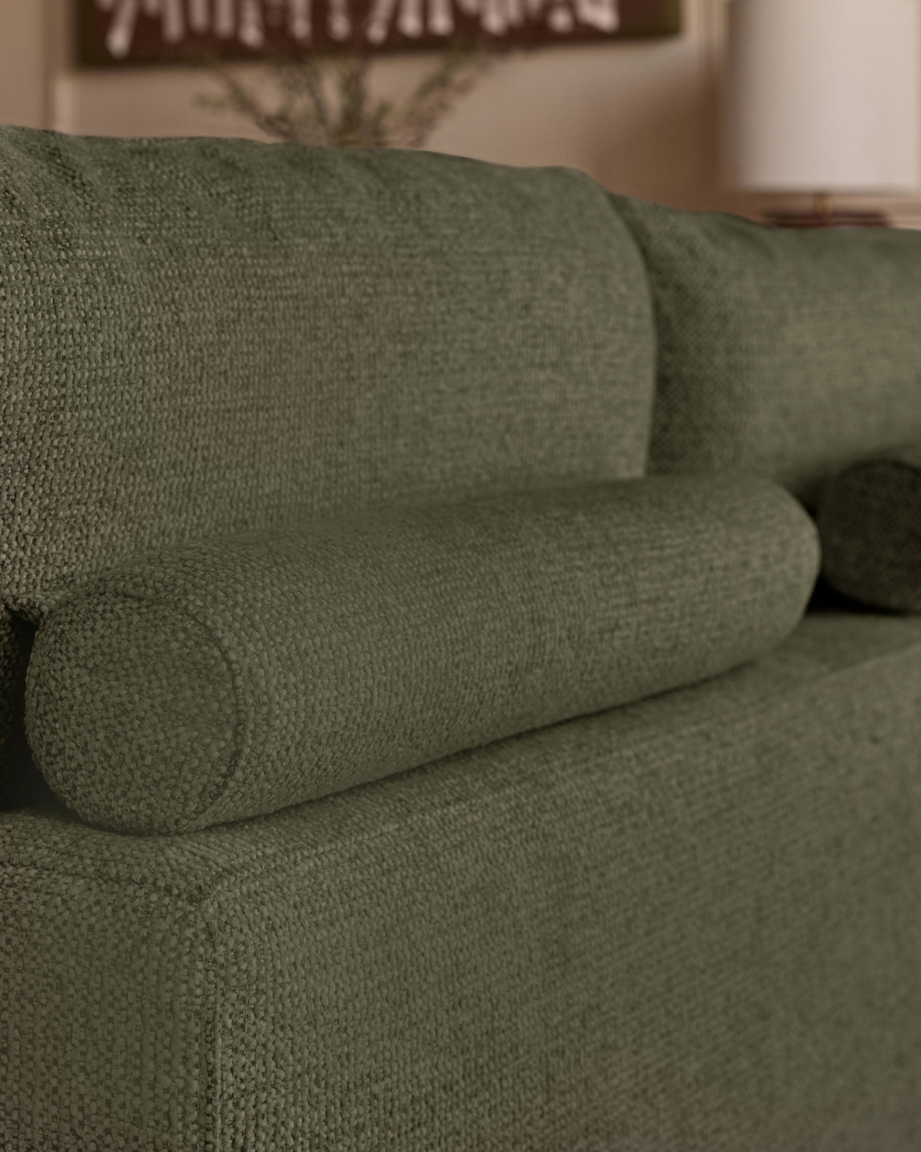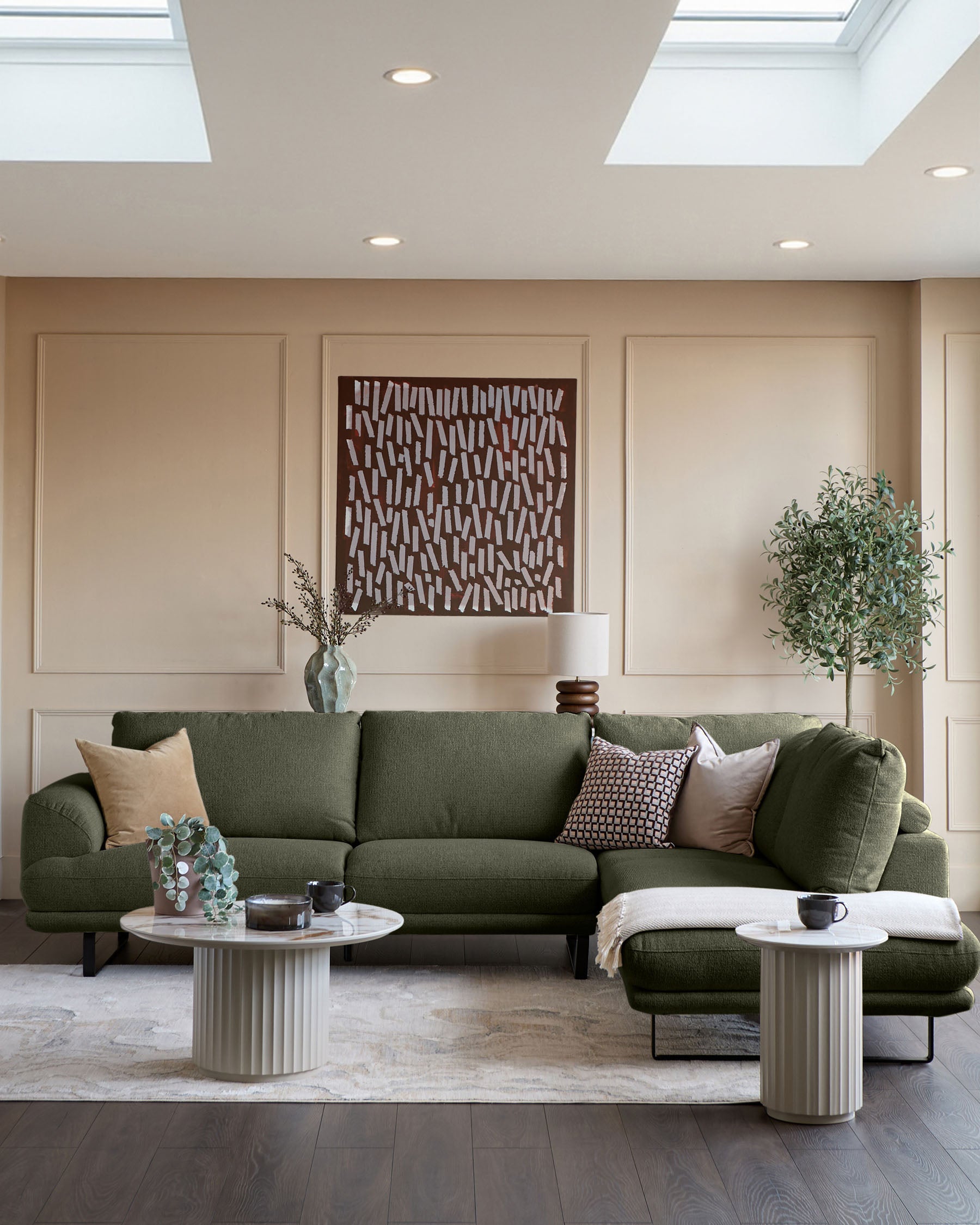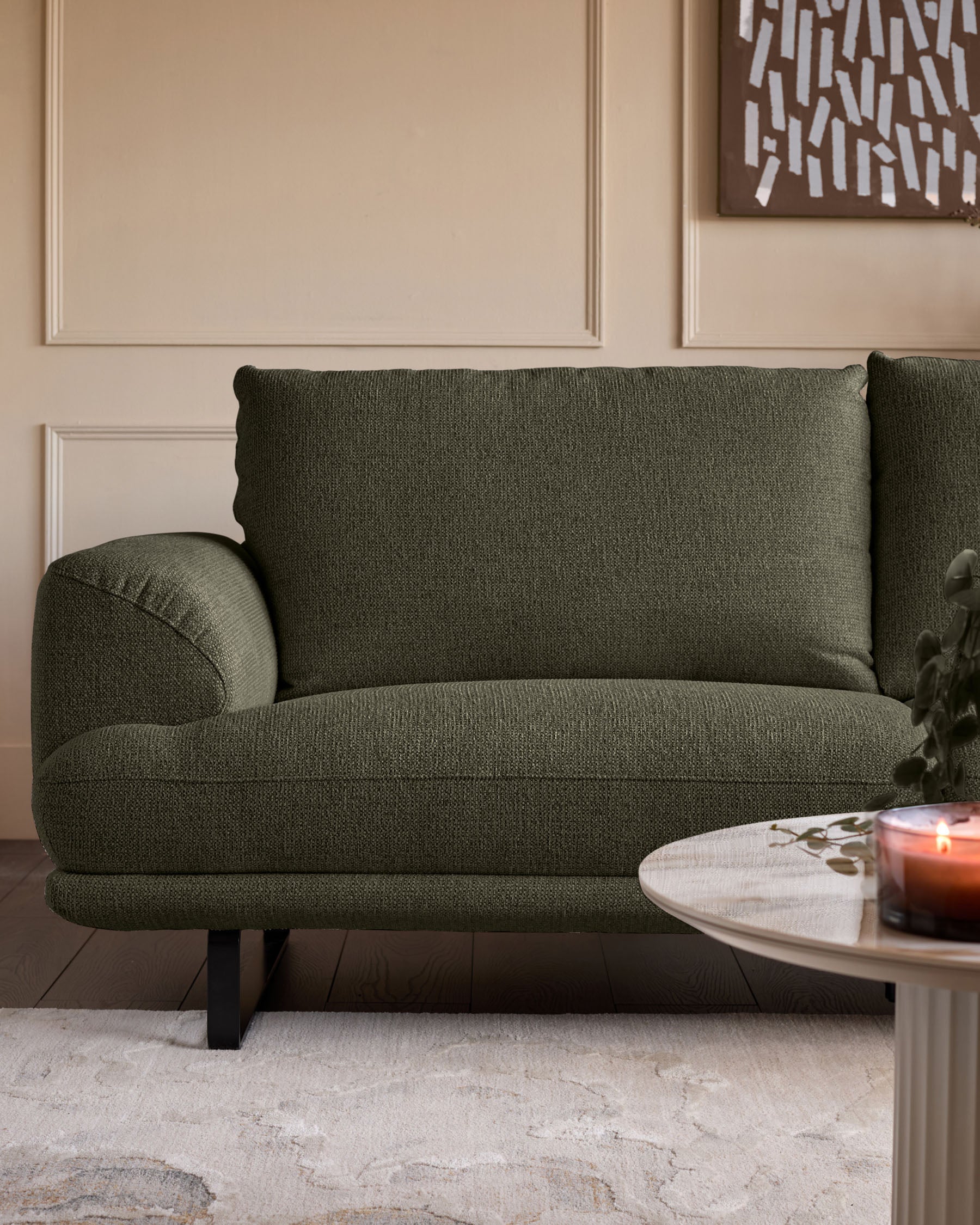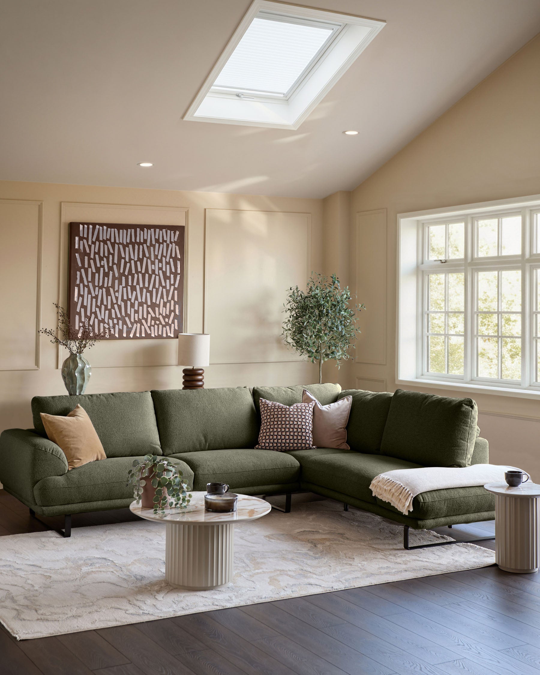 In Olive Green plush chenille, the right-hand Colette sofa introduces a warm, contemporary elegance to any living space. Its right-hand shape opens the room, guiding movement and creating a natural hub for relaxed conversations and effortless lounging. The integrated armrest flowing into the seat gives the sofa its signature sculptural look, while the high loop-style legs add a modern floating feel. Selected in our studio with intention behind every line, Colette blends generous comfort with a lightweight aesthetic that never overwhelms the room. The plush chenille offers a soft, inviting texture with durability built for real life. Thoughtful, independent and beautifully crafted, Colette transforms the everyday into moments that feel calm, connected and considered.