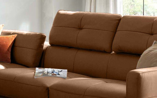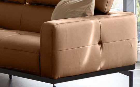The Colton tan leather 3 seater sofa brings sophisticated comfort to modern living spaces. Upholstered in exclusive tan Autograph leather with refined seam detailing, this streamlined sofa features deep foam and fibre-filled cushions for indulgent relaxation. Cleverly concealed adjustable headrests provide extra support without disrupting the clean, low-back profile that makes the Colton perfect for both minimalist and loft-style interiors.
