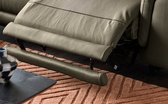 Thoughtfully designed for the way you actually live, the Connor olive green leather right hand corner chaise sofa brings sophisticated comfort to your space. Upholstered in rich olive green leather with a distinctive layered plinth base, this statement piece features an electric recliner with USB-C charging. The generous chaise creates the perfect spot for gatherings that stretch into the evening.