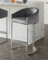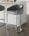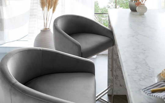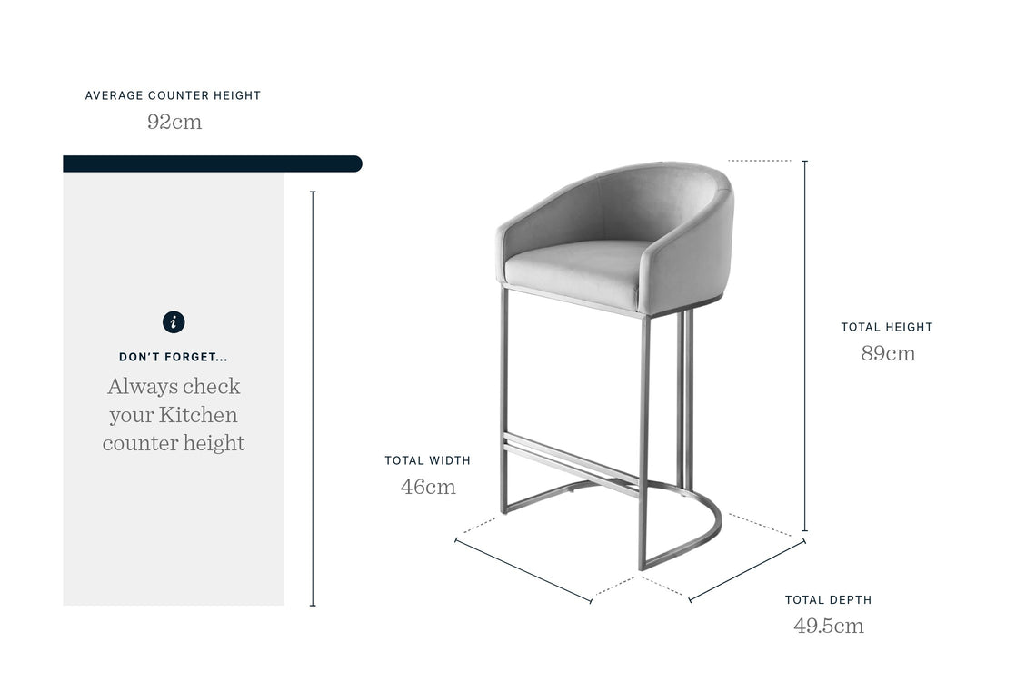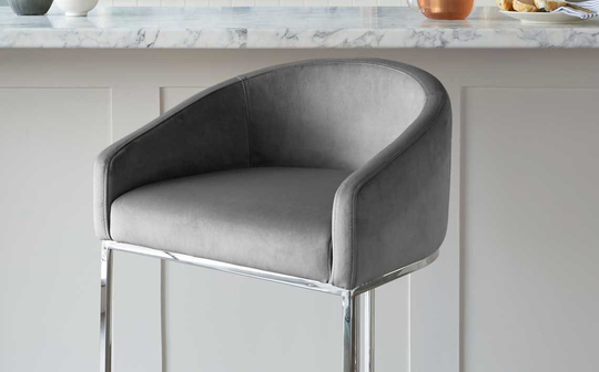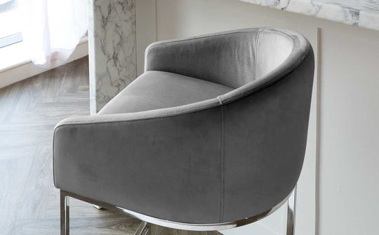 Effortlessly sophisticated with its Art Deco-inspired curves, the Dakota dark grey velvet bar stool brings understated glamour to your kitchen island or breakfast bar. Sumptuous dark grey velvet meets polished stainless steel for a look that's both luxurious and practical. The generously cushioned seat and curved backrest create the perfect perch for morning coffee or evening gatherings.