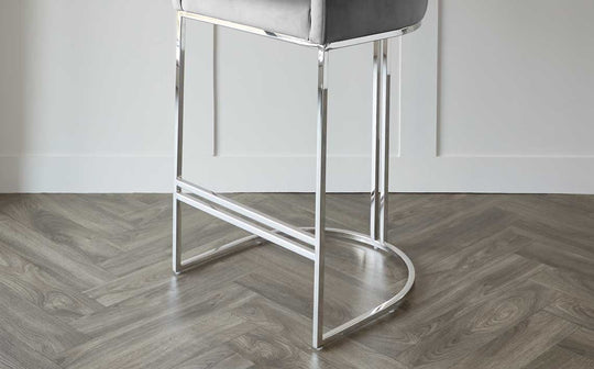 Effortlessly sophisticated with its Art Deco-inspired curves, the Dakota dark grey velvet bar stool brings understated glamour to your kitchen island or breakfast bar. Sumptuous dark grey velvet meets polished stainless steel for a look that's both luxurious and practical. The generously cushioned seat and curved backrest create the perfect perch for morning coffee or evening gatherings.