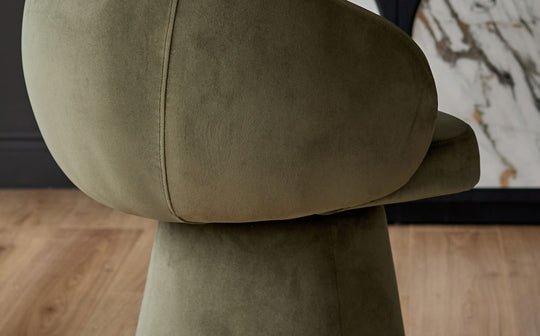 Thoughtfully designed with soft curves and a sculptural silhouette, the Darcy olive green velvet swivel chair brings warmth and organic richness to your dining space. Its 180¡ self-correcting swivel mechanism glides effortlessly, while the fully upholstered pedestal base creates a seamless, crafted finish that's both grounded and fluid.