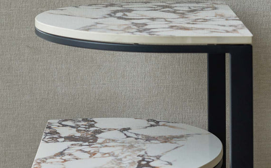 The Demi white Calacatta ceramic side table brings sculptural sophistication to your space with its distinctive semi-circular silhouette. This exclusive two-tier design pairs a luxurious white Calacatta ceramic top with sleek black metal legs, creating a striking focal point beside your sofa or bed. The lower shelf provides stylish storage while maintaining the table's airy, contemporary feel.