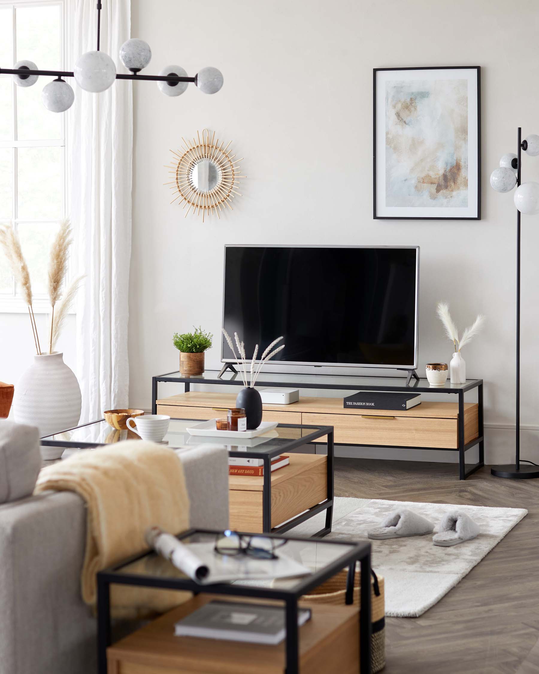 Our TV stand range showcases a careful blend of design and functionality, ensuring your living room stays organised without compromising on style. The collection includes units crafted from a variety of materials, from smoked glass to dark ash veneer, light grey painted wood to marbled ceramic, offering a diverse choice to complement any contemporary home.