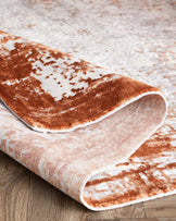 Luxurious textured area rug with a rolled corner, showcasing a plush rust and cream abstract pattern on a wooden floor.