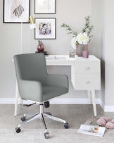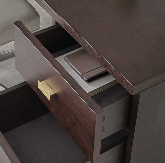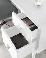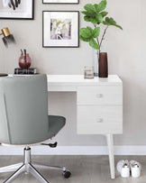 Who said a home office couldn't be luxe? The Drew desk offers style and practicality with its on-trend white oak finish and modern metallic handles. Two spacious drawers, complete with soft-close runners and velvet lining, provide ample storage for all your work-from-home essentials. A discreet cable management hole keeps charging neat and tidy. Style the Drew desk with a comfortable occasional chair, a sleek desk lamp, and minimalist accessories. It's the perfect addition to a modern home office or a stylish workspace in any room.Details