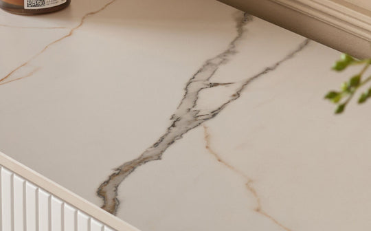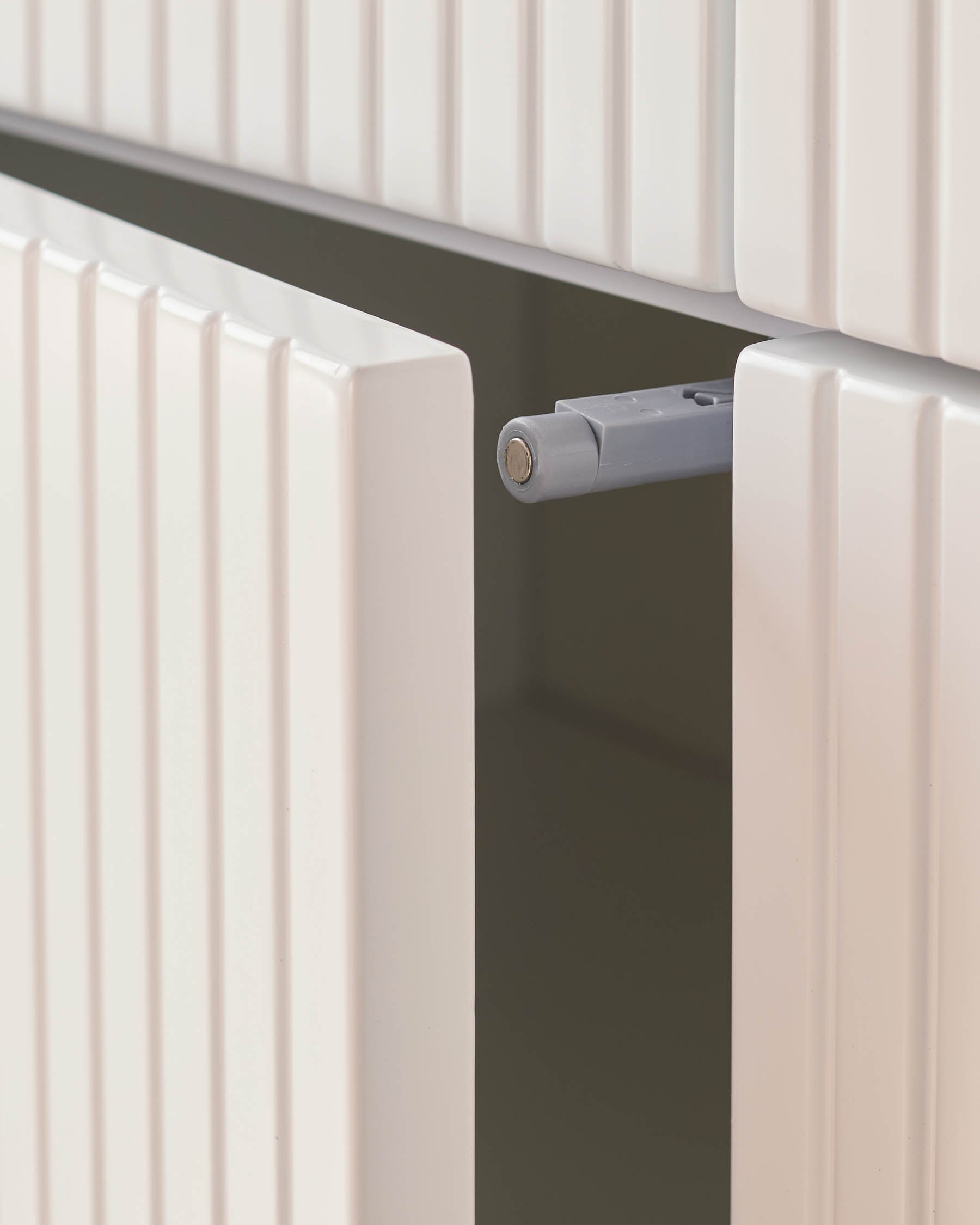 The Edie large sideboard brings quiet sophistication to your dining space with its crisp white frame and natural ceramic top. Cool to the touch and beautifully resilient, this generously proportioned piece offers ample storage behind push-to-open doors. Perfect for dining rooms where conversations linger or hallways that need both style and function.