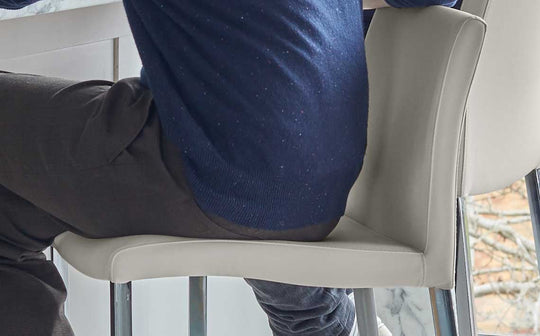 The Elise bar stool brings sophisticated comfort to your breakfast bar or kitchen island. Soft light grey faux leather meets sleek polished chrome for a contemporary look that works beautifully in modern spaces. Sold in pairs, these fixed-height stools offer cushioned comfort for morning coffee or evening gatherings, with built-in floor protectors keeping your surfaces pristine.
