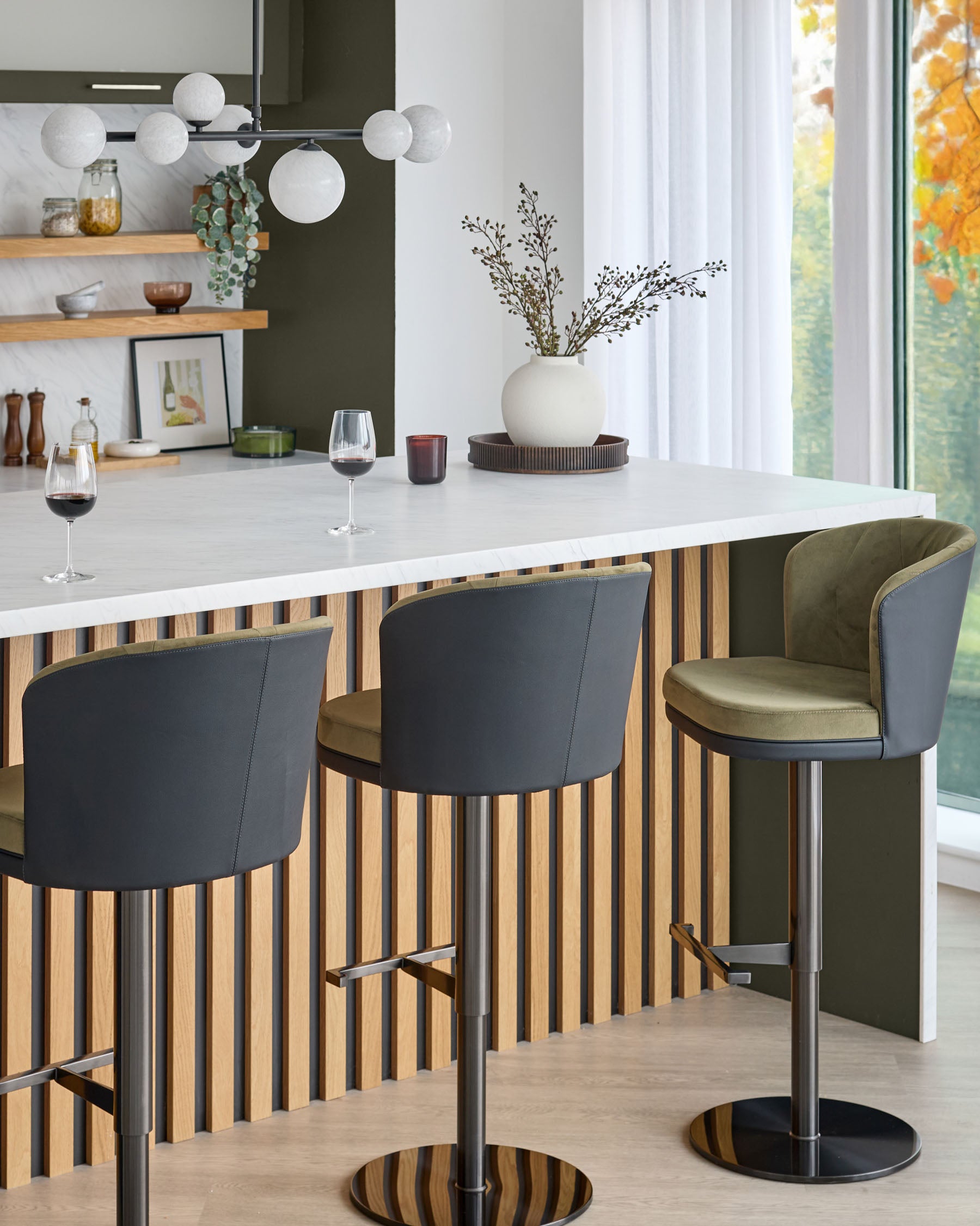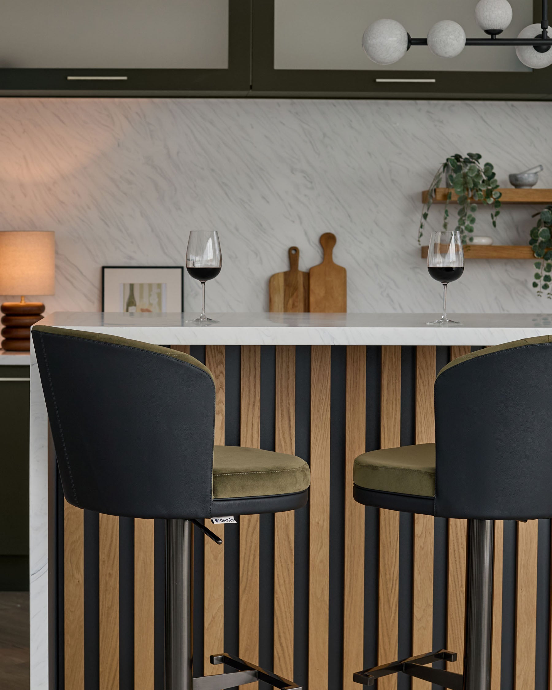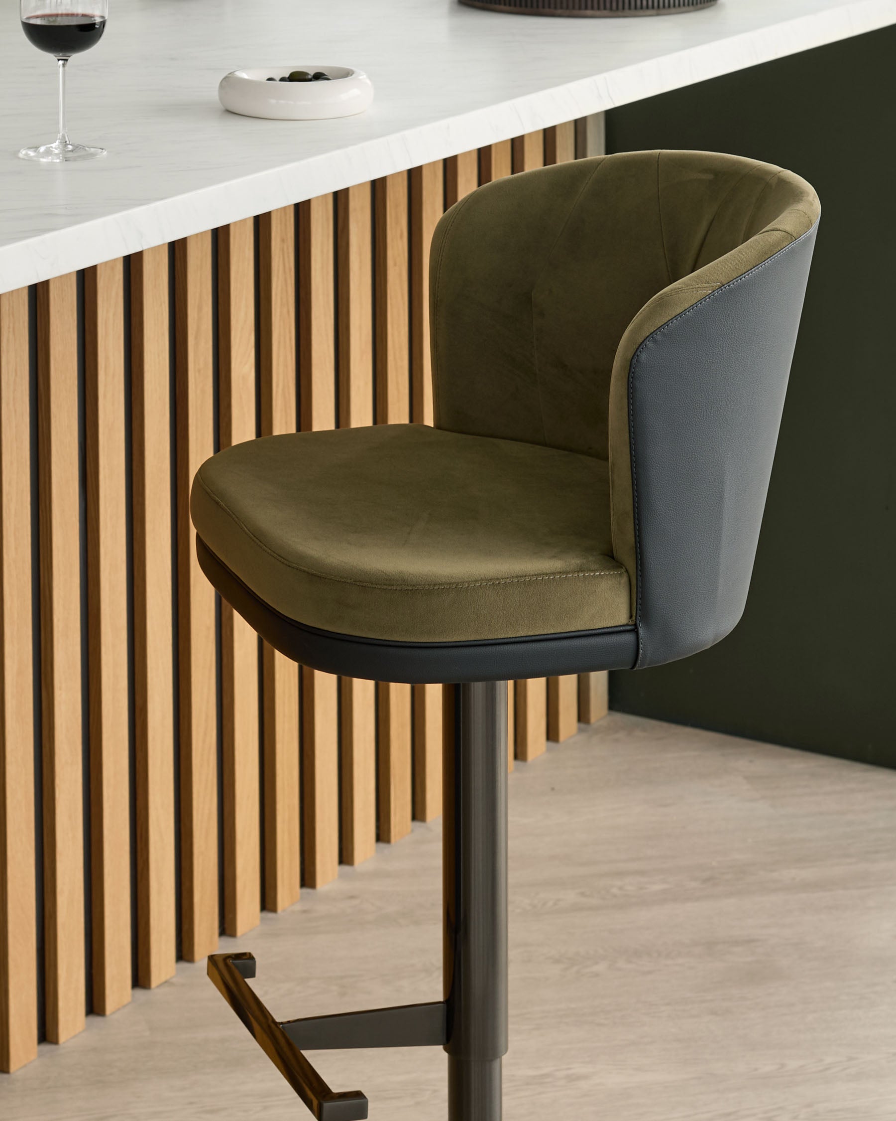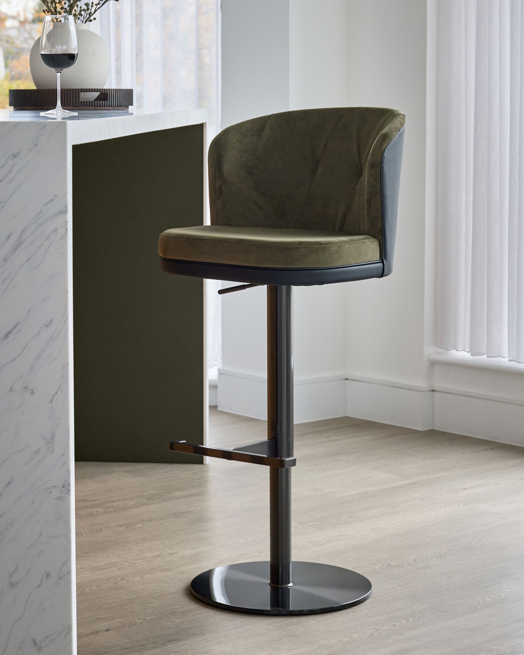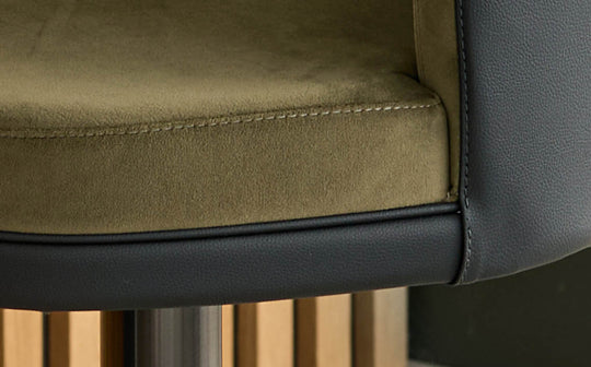 Thoughtfully designed in our Berkshire studio, the Elodie gas lift bar stool brings sophisticated contrast to your kitchen island or breakfast bar. Rich olive green recycled velvet meets sleek black faux leather in a design that adapts effortlessly to real life. The gas lift mechanism glides smoothly from 56cm to 84cm, while the 360-degree swivel ensures conversations flow as naturally as your morning coffee.
