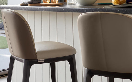 The Emerson natural and mocha leather bar stool brings sophisticated contrast to your kitchen island or breakfast bar. Upholstered in genuine two-tone leather, this fixed-height stool features a distinctive chamfered plinth base and curved edges that soften its architectural lines. The dark wood frame grounds the design whilst built-in floor protectors ensure your surfaces stay pristine.