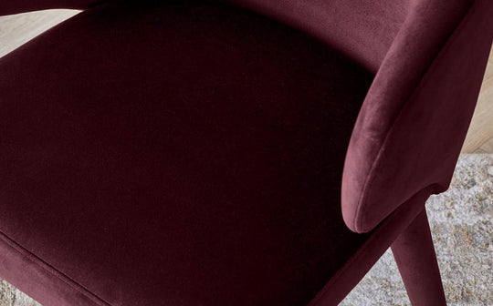 The Ethan plum velvet dining chair brings rich texture and lasting comfort to your dining space. Deep plum velvet wraps around generous cushioning, creating a seat that's as inviting as it is sophisticated. With its sleek silhouette and subtly tapered legs, this chair strikes the perfect balance between refined style and real-life durability – made for weekday dinners and weekend celebrations alike.