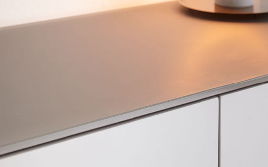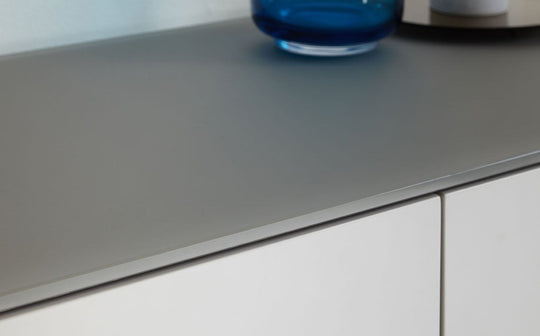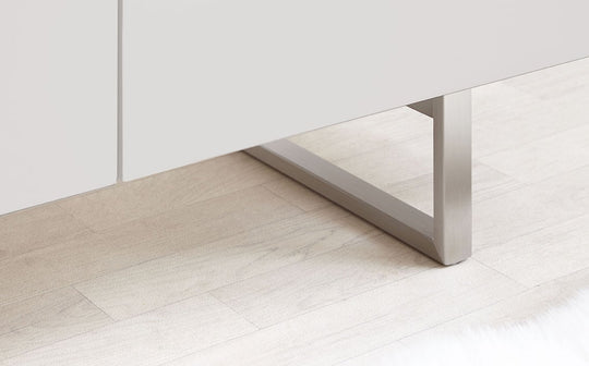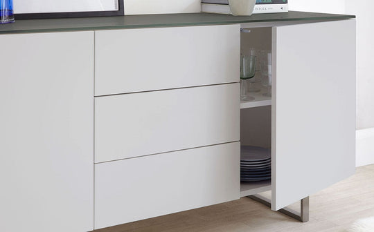 With its frosted grey glass and sleek matt grey finish, the Eve sideboard offers a contemporary feel. Designed in-house, this exclusive piece features smooth push-open doors, revealing adjustable shelving within. Brushed stainless steel accents add a touch of understated glamour, while floor protectors ensure your surfaces stay pristine. Style the Eve sideboard with metallic accessories like a statement lamp or decorative bowl. It pairs beautifully with a console table or coffee table, creating a cohesive and contemporary look. The Eve sideboard is a versatile piece suitable for modern living rooms, dining rooms or hallways.Details