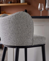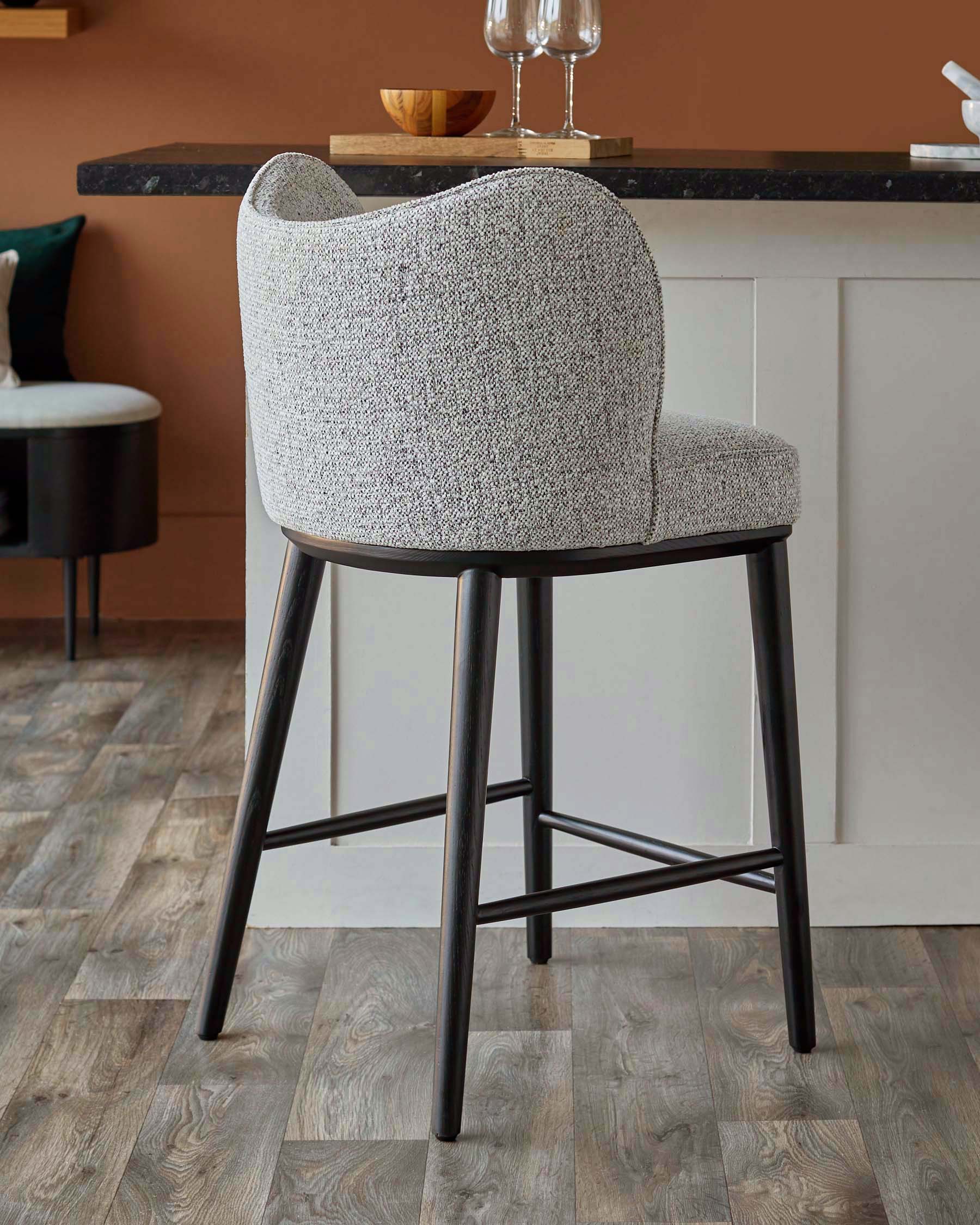 The Evelyn grey fabric bar stool brings understated luxury to kitchen islands and breakfast bars. Exclusively designed with exaggerated curves and a high wraparound backrest, this sophisticated piece offers exceptional comfort for casual dining. The soft grey salt and pepper chenille upholstery pairs beautifully with sleek black wooden legs, creating a timeless look that works in both modern and traditional spaces.