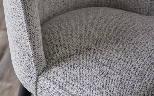 The Evelyn grey fabric bar stool brings understated luxury to kitchen islands and breakfast bars. Exclusively designed with exaggerated curves and a high wraparound backrest, this sophisticated piece offers exceptional comfort for casual dining. The soft grey salt and pepper chenille upholstery pairs beautifully with sleek black wooden legs, creating a timeless look that works in both modern and traditional spaces.