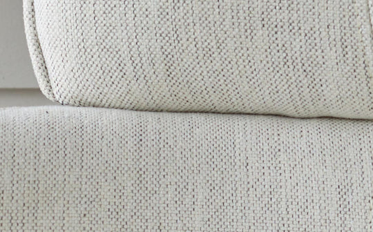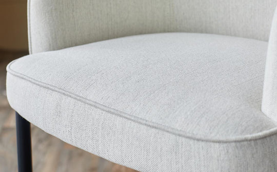 Close-up of a stylish, light-coloured armchair with a textured fabric, showcasing its design and comfort.