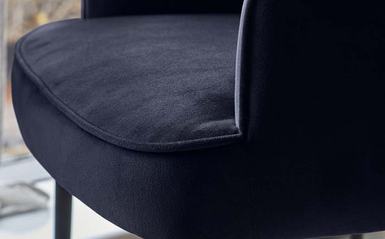 The Felix dark navy velvet dining chair brings sculptural sophistication to your dining space. Its distinctive 3D structure creates visual interest from every angle, while the curved back and cushioned seat ensure comfort through long dinner parties. The rich navy recycled velvet upholstery paired with sleek black metal legs strikes the perfect balance between luxury and contemporary style.