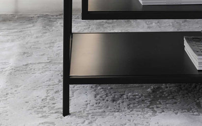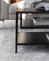 Modern living room featuring a minimalist, rectangular coffee table with a matte black metal frame and a sleek black tabletop. The table includes a lower tier with additional shelving space for books and decorative items. Gray textured sofa with a burnt orange throw pillow complements the table, both positioned on a light grey plush area rug. White credenza and artwork adorn the background, with natural light streaming through sheer curtains.