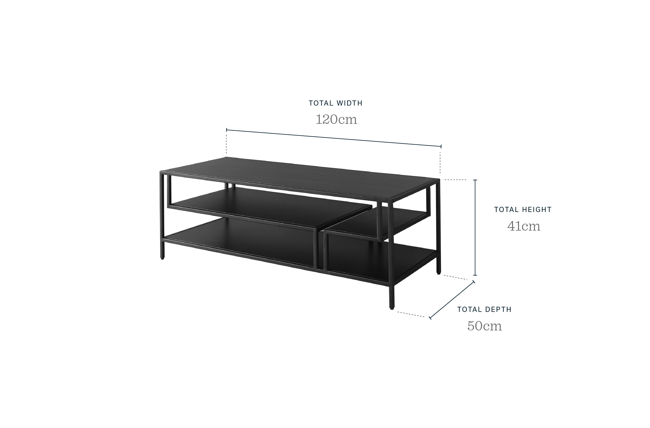 The Finley black metal coffee table brings sophisticated storage to modern living rooms. Its striking asymmetric design features two offset shelves beneath a spacious rectangular top, creating visual interest whilst keeping essentials organised. The powder-coated steel frame in matte black pairs beautifully with the black oak finish shelves, offering durability that's built for real life.