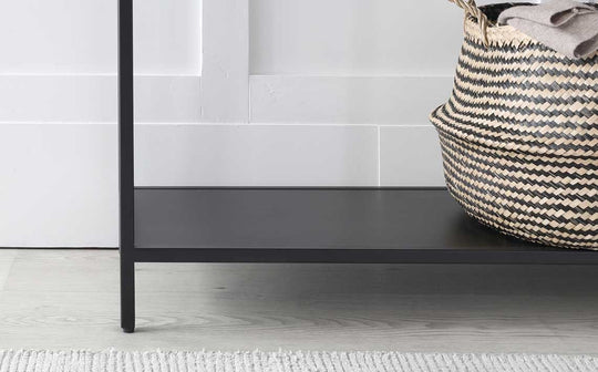 The Finley black metal console table brings contemporary style to any space with its striking cut-out detailing and robust powder-coated steel frame. Perfect for hallways, living rooms or home offices, this versatile piece features two open shelves with a black oak finish, offering practical storage whilst maintaining a minimalist aesthetic that works beautifully in modern interiors.