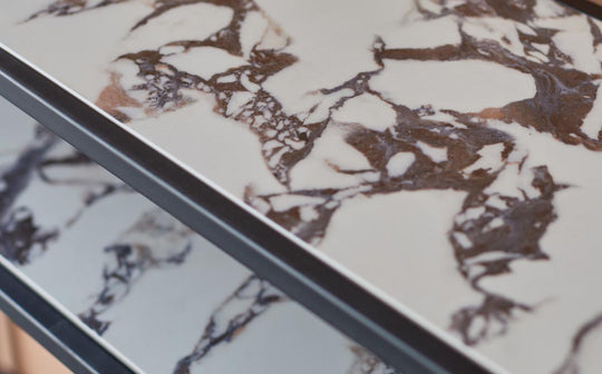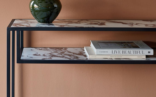 The Finley white Calacatta ceramic console table brings sophisticated style to hallways, living rooms and dining spaces alike. Its striking stepped design creates visual interest across multiple levels, perfect for displaying treasured objects, while the luxurious white Calacatta ceramic top offers marble-inspired beauty with practical durability. Heat-resistant and scratch-resistant, it's built for real life.
