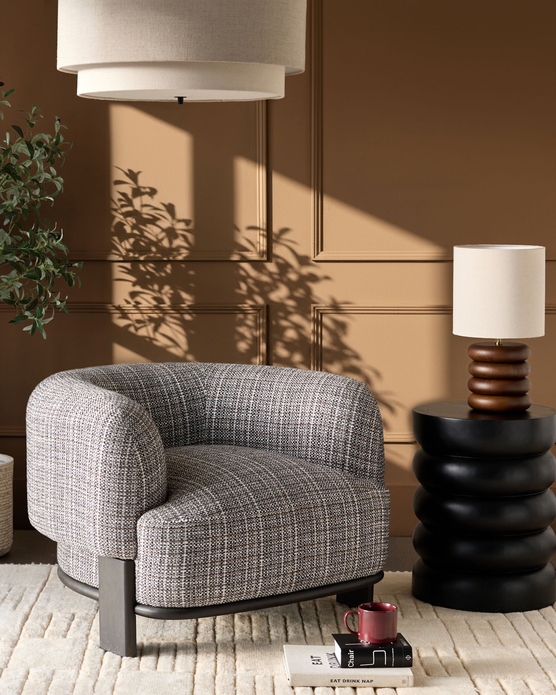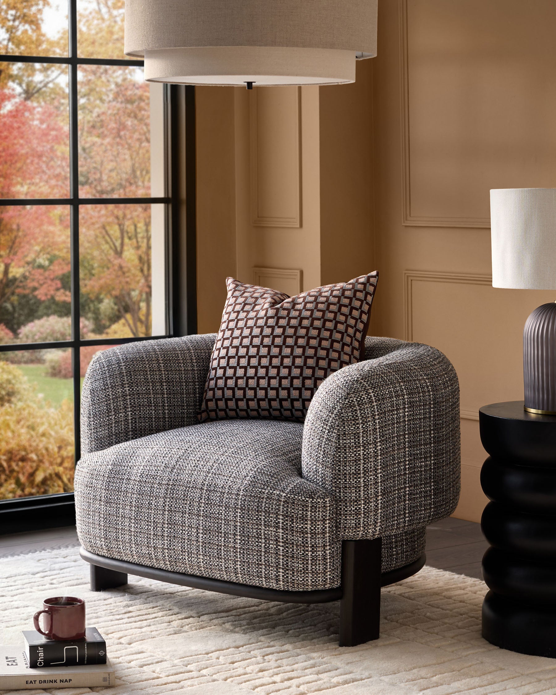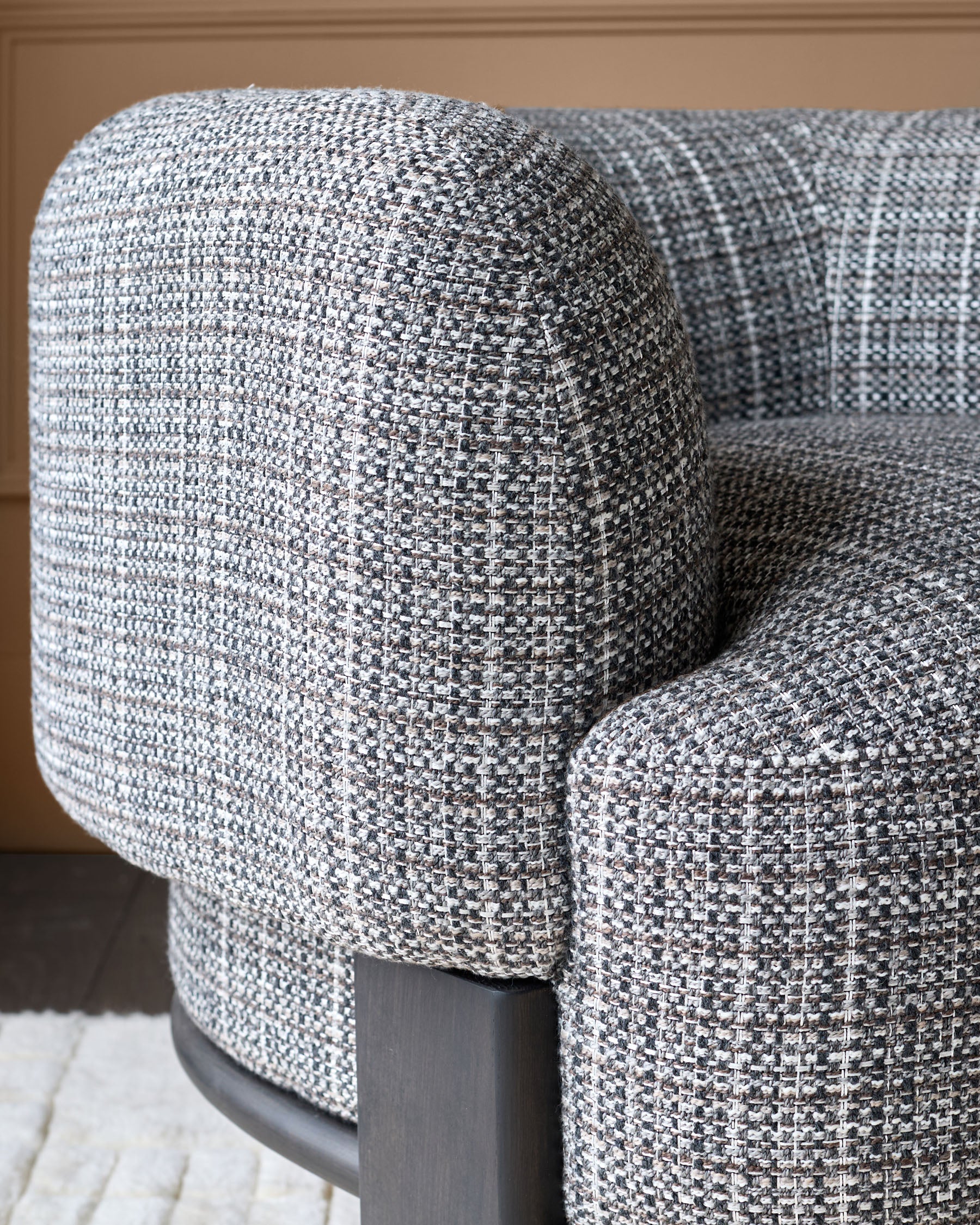 The Florence Armchair in Dark Mocha Bold Weave brings a grounded, sculptural presence to the living space, shaped with a rounded silhouette and chunky arms that feel both comforting and contemporary. The bold weave fabric adds a tactile richness, contrasting beautifully with the dark wood legs and frame detailing that anchor the design with a crafted elegance. Fixed foam cushions provide lasting support, enhanced by zig-zag springs that ensure durability for real-life lounging. Every curve has been considered to balance softness and structure, creating a chair that invites you to settle in and unwind. With its expressive shape and enduring comfort, Florence becomes a statement piece that elevates any room while remaining effortlessly livable.