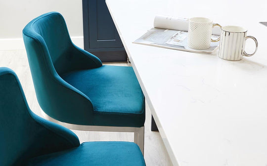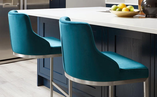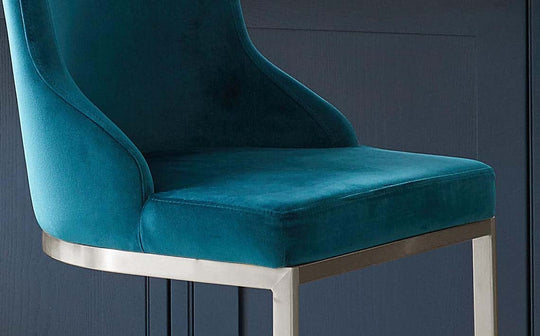 Gather everyone together in luxurious comfort with the Form dark teal velvet and brushed steel bar stool. This designer bar stool combines tactile velvet upholstery with a sleek stainless steel base, creating a stylish and supportive seat. The plush velvet upholstery adds a touch of opulence, while the gently curved backrest and padded seat provide exceptional comfort. The sturdy cantilever frame offers a subtle bounce while seated, making it perfect for lingering conversations at your breakfast bar or kitchen island. Sold in pairs, these bar stools complement a clean-lined aesthetic and work beautifully alongside a contemporary dining bench or a coordinating dining set.Details