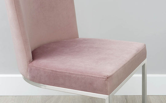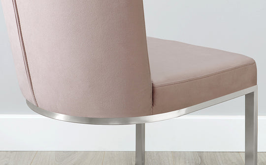 Bring sophisticated comfort to your dining space with the Form dining chair. This exclusive design pairs sumptuous blush pink velvet with a sleek brushed steel cantilever frame, creating a piece that's both glamorous and inviting. The curved seat flows seamlessly into the backrest, offering cushioned support for lingering dinner conversations. Sold in pairs to perfectly frame your table.