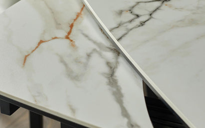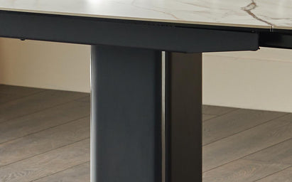 The Fraser natural ceramic extending dining table adapts seamlessly to your needs, rotating smoothly from an intimate 4-seater to a spacious 6-seater configuration. Its resilient ceramic top in a natural matt finish stands up to hot dishes and daily use, while the sleek black metal pedestal base provides stability without crowding legs underneath. Perfect for everything from weekday breakfasts to weekend dinner parties.