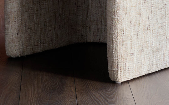 The Freya natural chenille dining chair brings soft elegance to your dining space with its floor-length silhouette and luxurious dual-yarn chenille upholstery. Generous cushioning and curved backrest create lasting comfort for those long dinner parties, while supportive armrests add an enveloping feel. Built for real life with adjustable floor protectors, this fully upholstered chair combines practical detail with refined proportions.