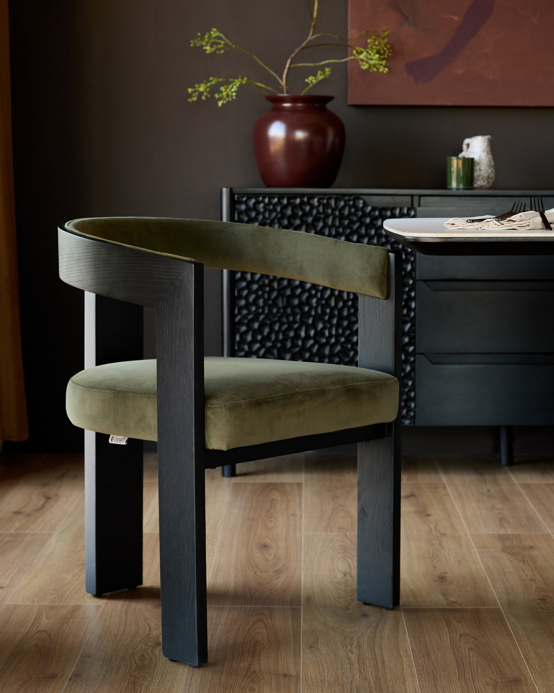 The Garcia olive green velvet dining chair brings sculptural sophistication to your dining space with its distinctive tripod leg structure and smooth, bent solid-wood frame. The recycled velvet upholstery adds rich depth and tactility, while the thoughtfully shaped armrests tuck neatly under tables yet provide comfortable support. Perfect for long dinners and lingering conversations.