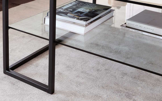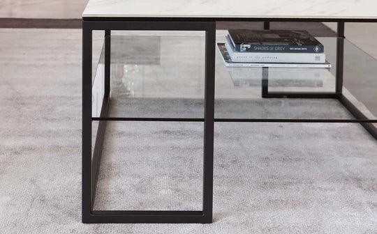 The Georgia white marbled ceramic coffee table brings sophisticated style to your living room with its striking square ceramic top and sleek metal frame. The marbled finish adds visual interest while the tempered glass lower shelf provides practical storage for books, magazines or decorative pieces. Built to handle real life, this contemporary piece combines durability with design.