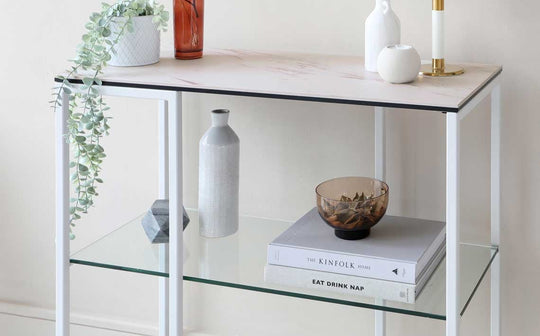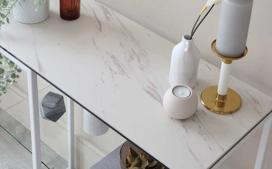 Effortlessly sophisticated, the Georgia white marbled ceramic small console table brings refined style to hallways, living rooms and bedrooms alike. Its sleek powder-coated steel frame and elegant ceramic top create a contemporary focal point, while the open tempered glass shelf offers generous storage without overwhelming your space. Perfect for displaying treasured accessories or creating an organised entryway.