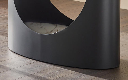 The Giotto natural ceramic 8 seater dining table brings sophisticated style to gatherings large and small. Its smooth oval top features distinctive veining that makes each piece unique, while the heat and scratch-resistant ceramic surface handles everything from morning coffee to dinner parties. The dark grey metal pedestal base provides rock-solid stability, with a clever integrated shelf for storing placemats or displaying decorative pieces.