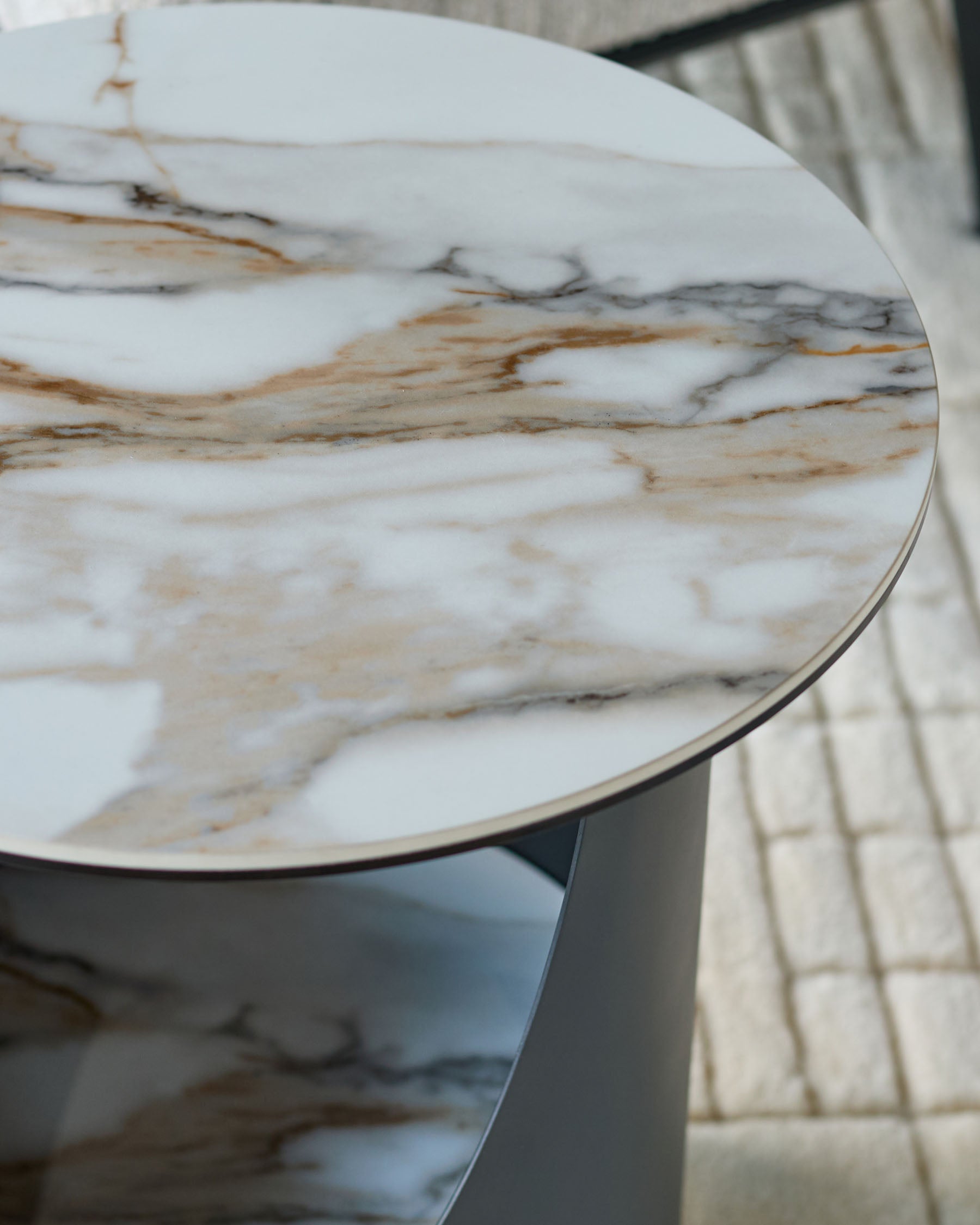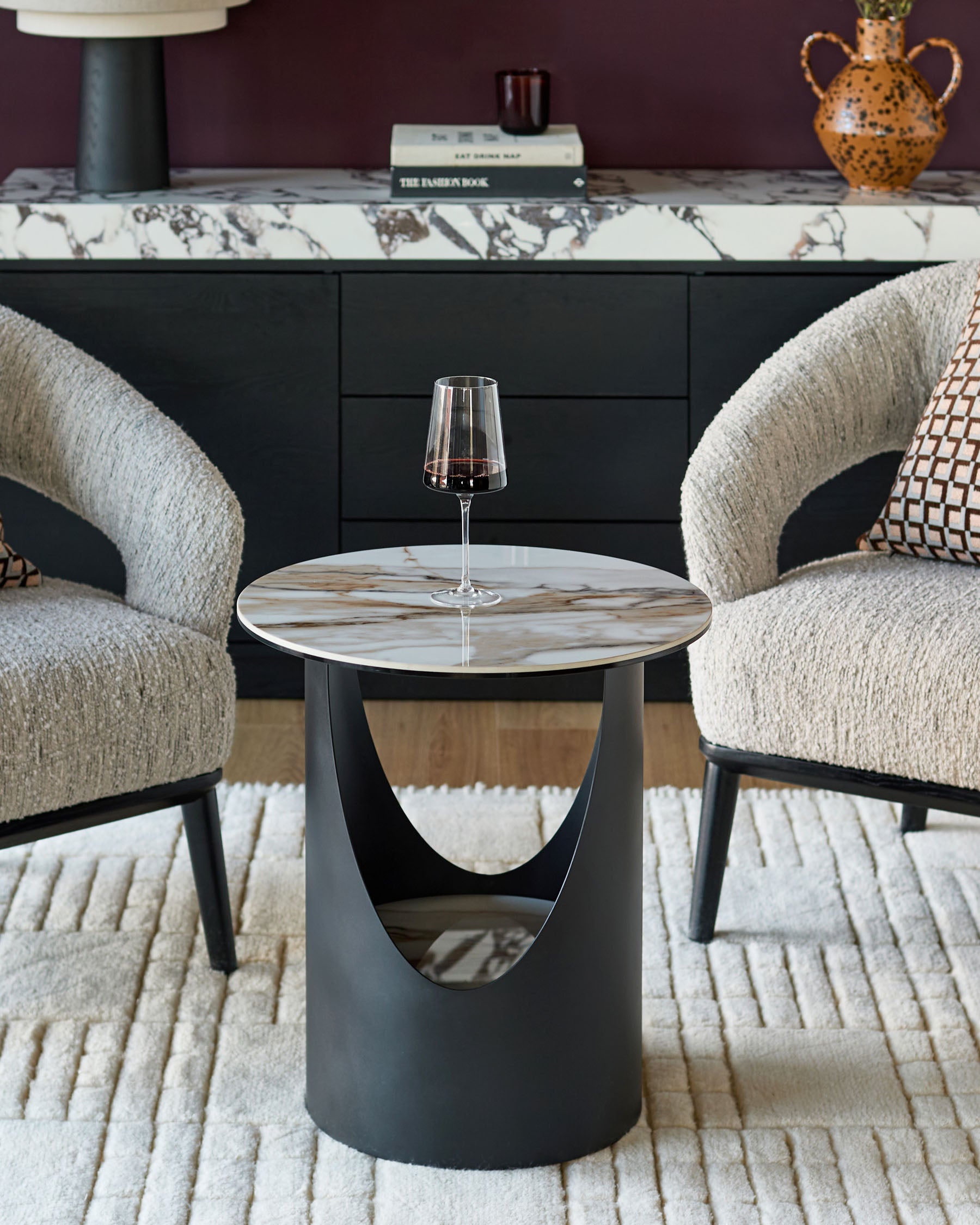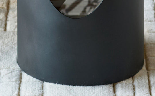 The Giotto Side Table is a beautifully sculptural piece, designed to bring quiet confidence and considered function to modern living spaces. Its natural gloss ceramic top features warm, flowing veining, with each table offering its own distinctive pattern, making every piece feel thoughtfully individual. The soft oval shape allows the design to sit effortlessly within a room, encouraging natural movement and balance around sofas and seating areas. Supporting the ceramic top is a black powder-coated steel base, creating a striking contrast while ensuring strength and stability built to last. An integrated ceramic shelf adds practical storage for books, magazines or everyday essentials, blending function with beauty in a way that feels seamless. Designed for the way you actually live, Giotto is tough enough for real life yet refined enough for your best moments, transforming everyday spaces with quality you can see and feel.
