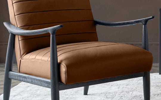 The Greyson tan leather occasional chair brings refined mid-century style to your living space. Genuine tan leather meets a sleek matt black wooden frame, creating a piece that's both timeless and contemporary. With its sculptural lines, subtle fluted detailing and supportive foam seating, this chair works beautifully in living rooms, reading corners or bedrooms Ð wherever you need a stylish spot to settle.