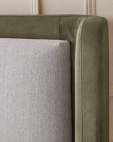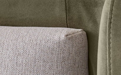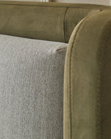 - Two-tone upholstery in natural cream fabric and olive green recycled velvet
