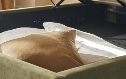The Grove natural fabric and olive green velvet king size ottoman storage bed brings sophisticated storage solutions to your bedroom. This exclusively designed piece features striking two-tone upholstery - natural cream fabric paired with olive green recycled velvet - creating an elegant focal point. With spacious ottoman storage accessed via robust hydraulic pistons and a double-layered headboard for supreme comfort, it's both practical and luxurious.