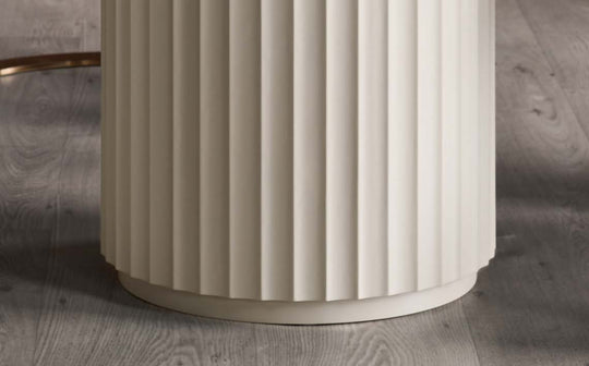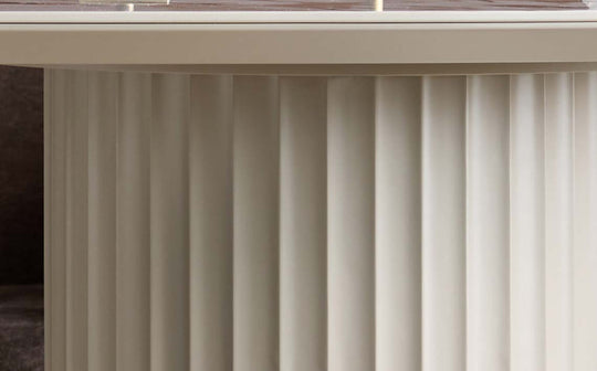 The Hanne natural ceramic 6 seater dining table brings architectural elegance to your dining space. Its high-gloss ceramic top showcases an intricate natural-effect finish, while twin pedestal bases with fluted panelling create visual interest. The double pedestal design provides generous legroom for 6, making both weeknight dinners and special gatherings comfortable and stylish.