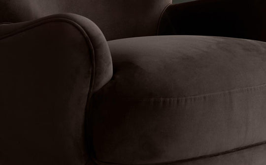 The Harlan dark chocolate velvet accent chair brings classic comfort to contemporary spaces. With its high winged back and sumptuously soft recycled velvet upholstery, this chair creates an inviting spot for reading, relaxing or adding sophisticated seating to any room. Dark wooden legs and rich mocha tones make it a versatile piece that works beautifully in living rooms, bedrooms or home offices.
