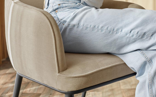 Effortlessly combining comfort and style, the Harley champagne chenille dining chair transforms everyday meals into memorable gatherings. Upholstered in soft, tactile chenille fabric with a warm champagne tone, this exclusively designed chair invites you to linger over dinner. The generous cushioning and curved armrests create a cocoon of comfort, while sleek black metal legs add contemporary sophistication.