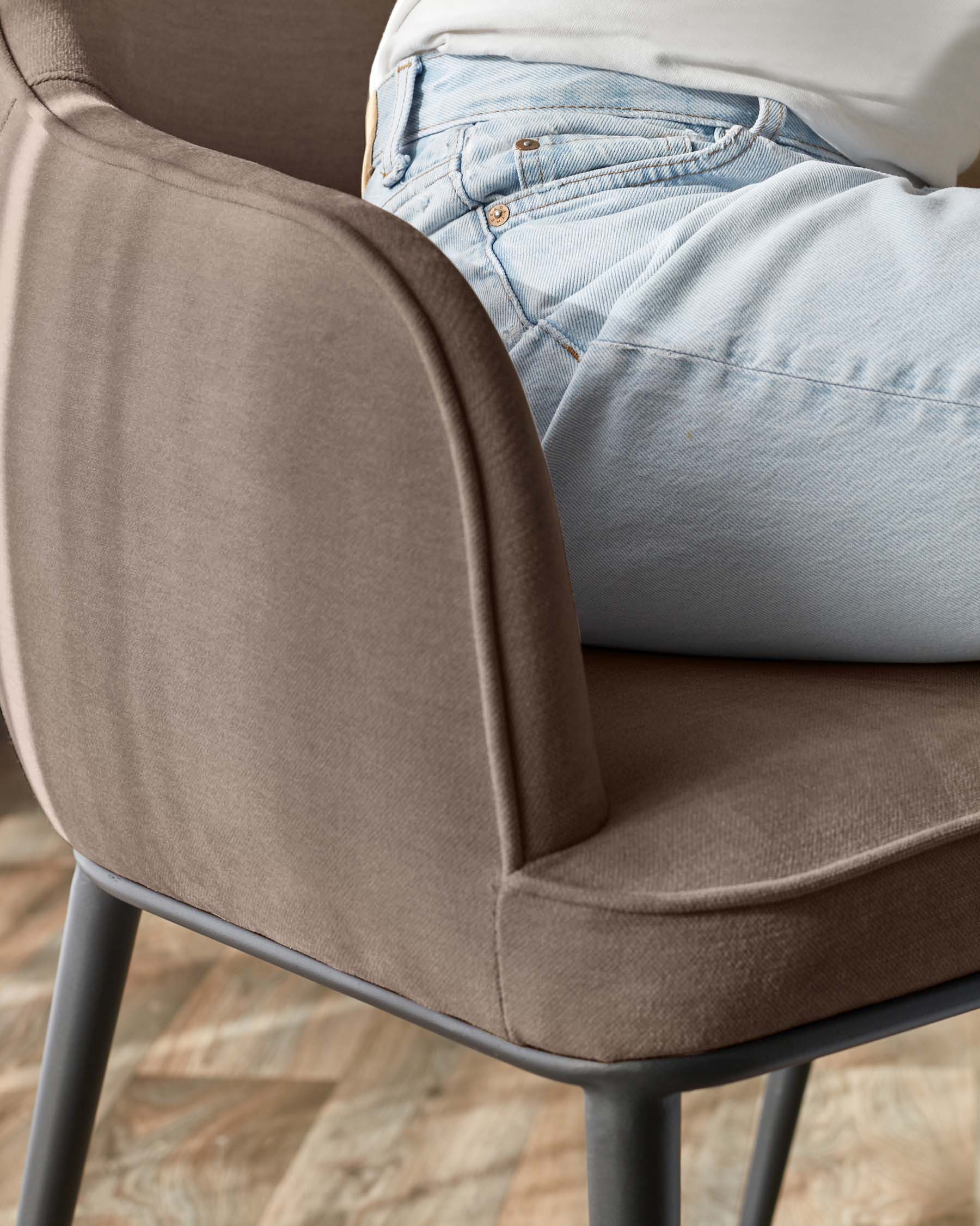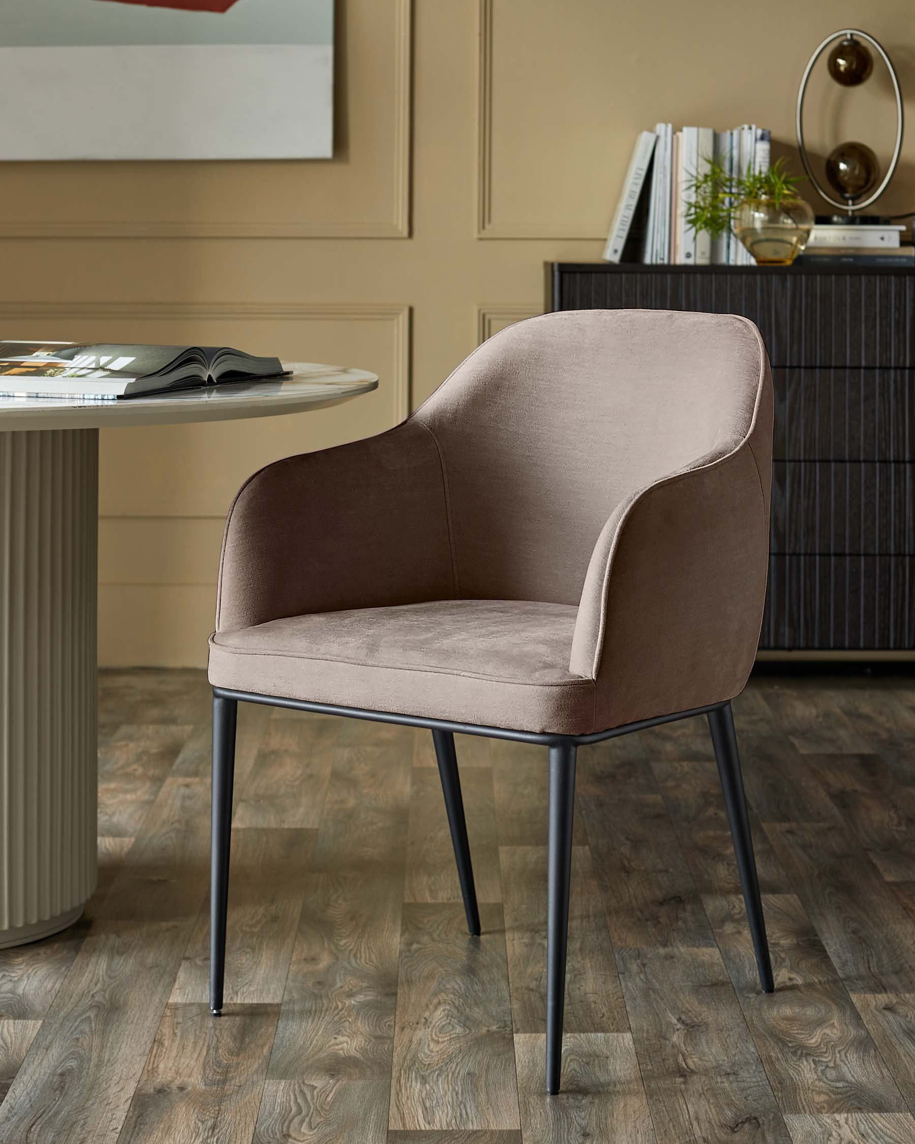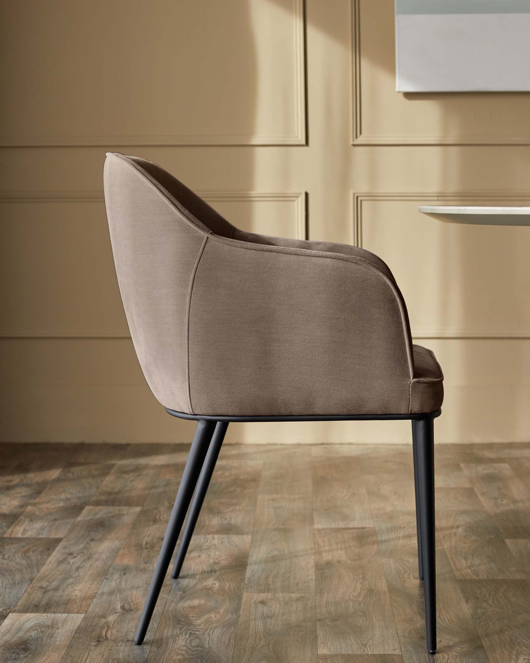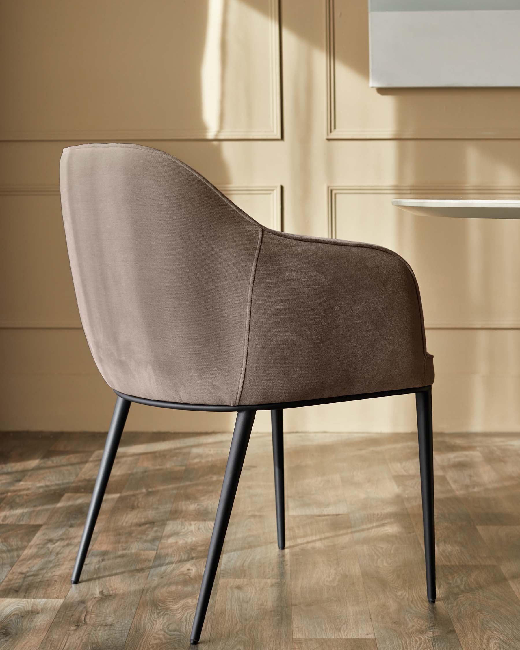 The Harley mocha fabric dining chair brings warmth and comfort to your dining space with its soft chenille upholstery in rich mocha tones. Exclusively designed with generous padding and integrated armrests, this chair invites long conversations over dinner. The sleek black metal legs add a contemporary edge, making it perfect for both casual weeknight meals and special occasions.