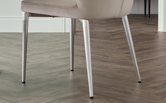 The Harper champagne plush velvet dining chair brings luxury to every meal. Its distinctive shell-shaped backrest features vertical ribbing that catches the light beautifully, while sumptuous velvet upholstery invites you to linger over dinner. Brushed stainless-steel legs add contemporary polish, making these chairs equally at home around a glass, wood or metal table.